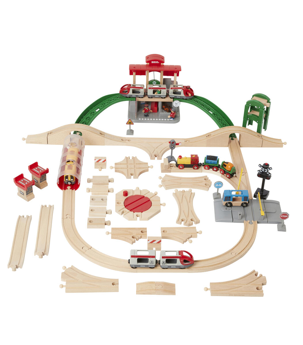 87 deler. Opplev en verden av togbaner. Ta en tur med de 2 moderne togene forbi stasjoner, lasteramper og over broer. Utforsk transportstrukturen med båt, buss og lastebil med tilhenger som kan kjøres på togbanen. Leveres i oppbevaringsboks med lokk, som også kan brettes ut til leketeppe. Av FSC-merket tre og malt med vannbasert maling. Fra 3 år.