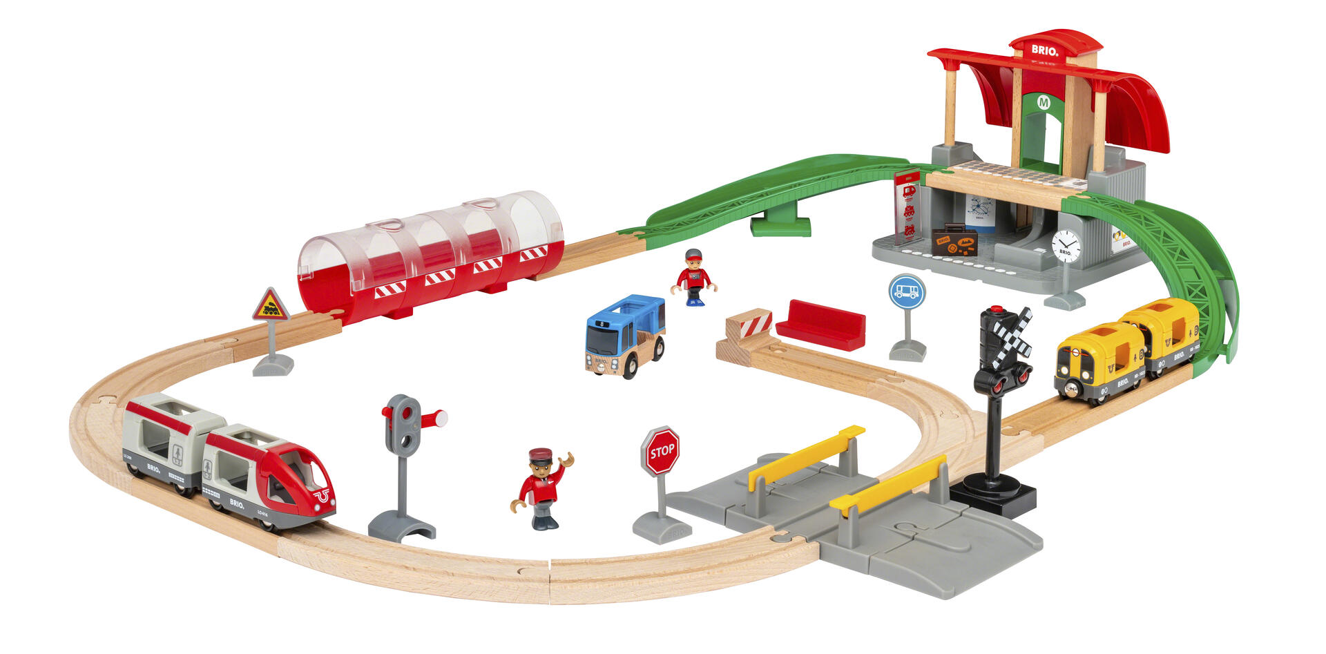 Inneholder 21 deler. 2 stablebare bropillarer, 2 oppkjøringsskinner, 2 sving vekslere, 1 snuskive, 1 T-veksel, 2 korte svingvekslere, 2 oppkjøringsskinner, 2 stoppbukker, 2 svingkryss, 1 krysskinne og 4 rette skinner. Av FSC-merket tre og malt med vannbasert maling. Fra 3 år.