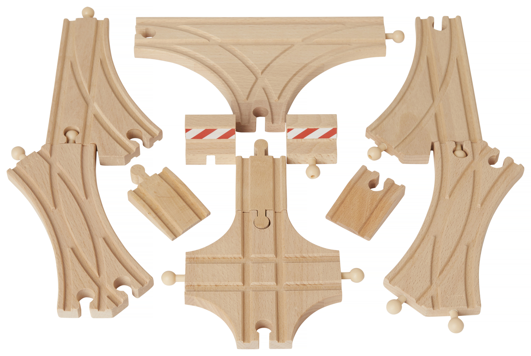 Inneholder 21 deler. 2 stablebare bropillarer, 2 oppkjøringsskinner, 2 sving vekslere, 1 snuskive, 1 T-veksel, 2 korte svingvekslere, 2 oppkjøringsskinner, 2 stoppbukker, 2 svingkryss, 1 krysskinne og 4 rette skinner. Av FSC-merket tre og malt med vannbasert maling. Fra 3 år.
