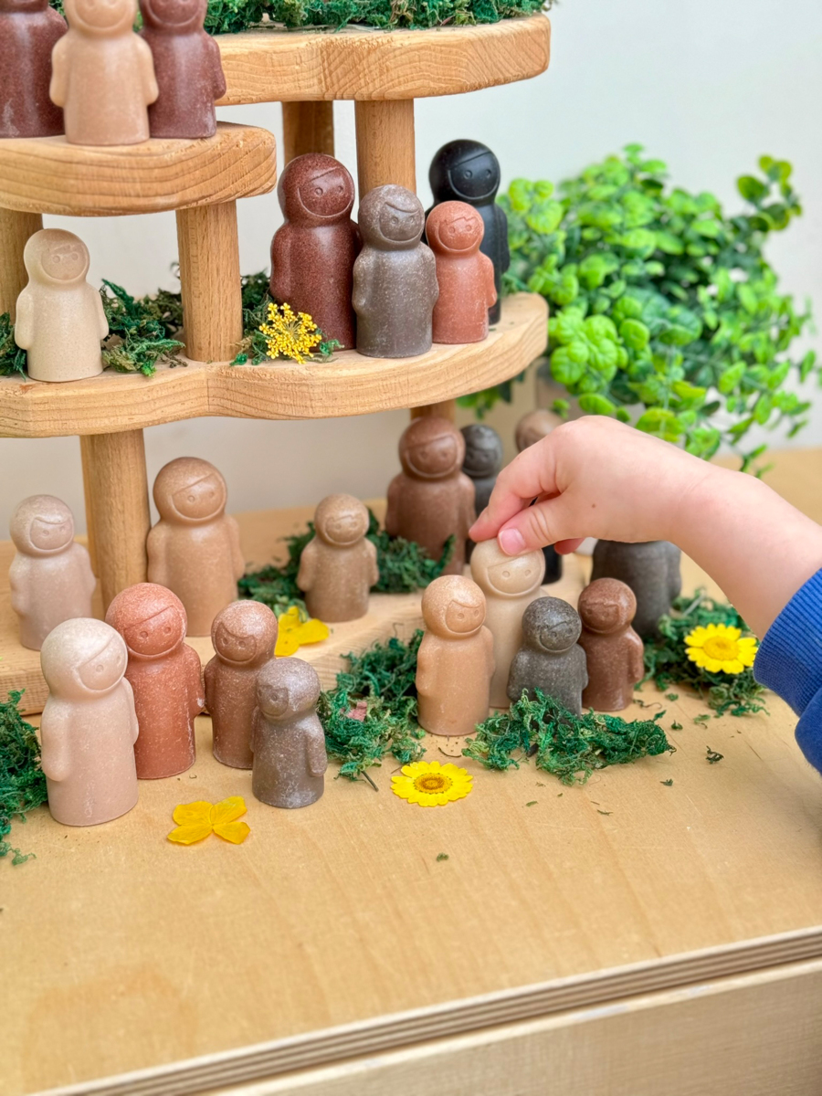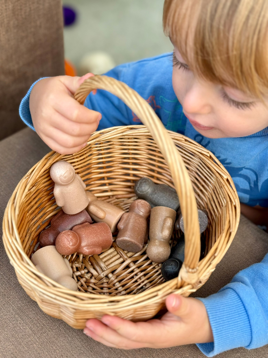 30 stk. Steinfigurer i 3 forskjellige størrelser med 10 forskjellige hudfarger og minimal mimikk slik at barnet inviteres til å bestemme følelsesuttrykkene. De er taktile og perfekte for sensorisk lek, men også for tidlig matematikk. Enkle å vaske. Passer utmerket både innendørs og utendørs. Mål: 5, 6, 7 cm. Materiale: stein. Fra 2 år.