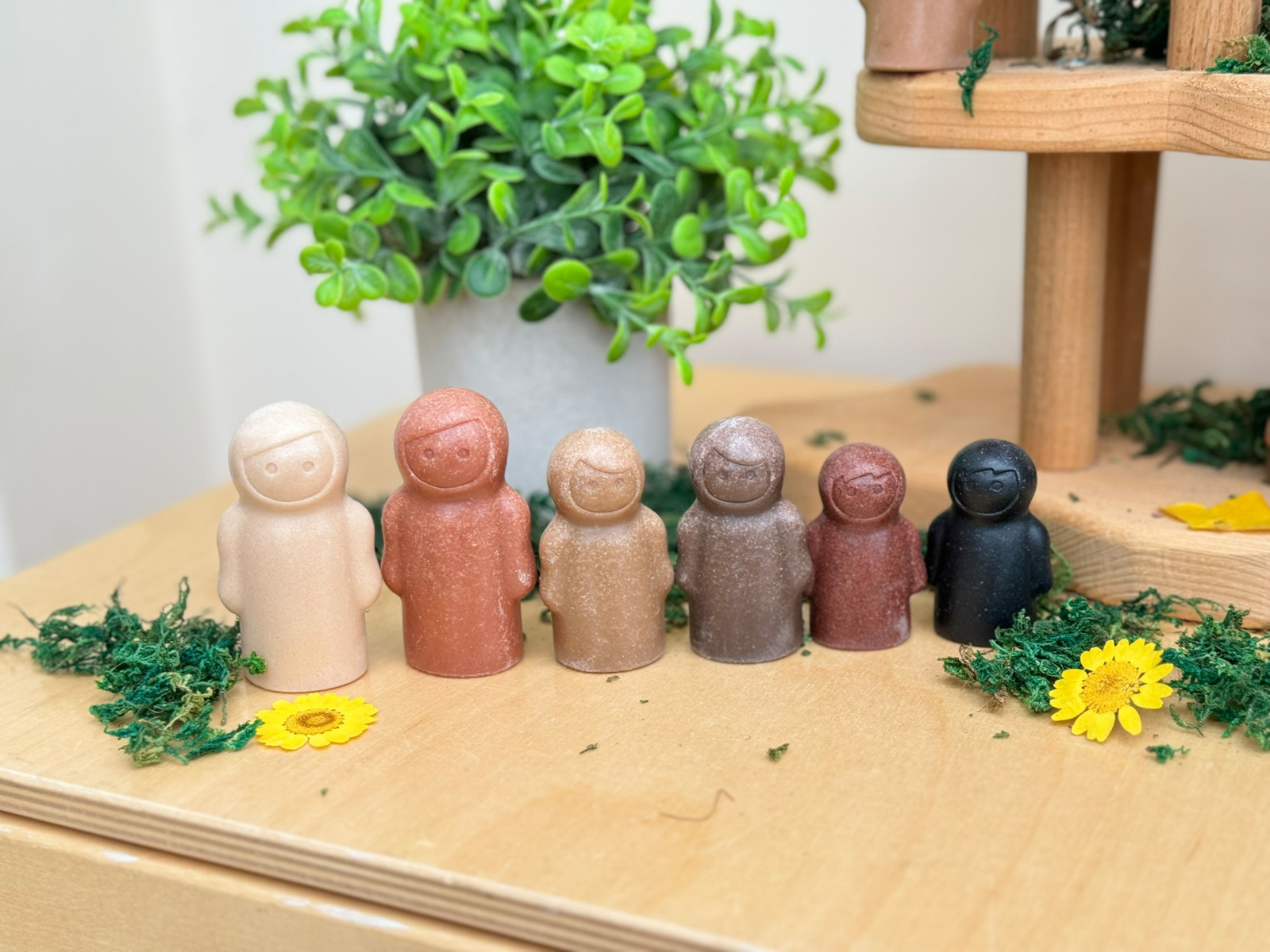 10 stk/pk. Disse sjarmerende små menneskene inviterer til åpen lek og diskusjoner om at vi alle er forskjellige. Lekefigurene er uten ansiktsuttrykk for å la barna velge hvordan de skal brukes. Av en steinblanding som gjør dem holdbare nok til utendørs bruk i all slags vær. Figurene er 5-7 cm høye. Fra 2 år.