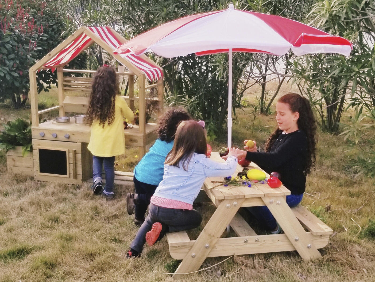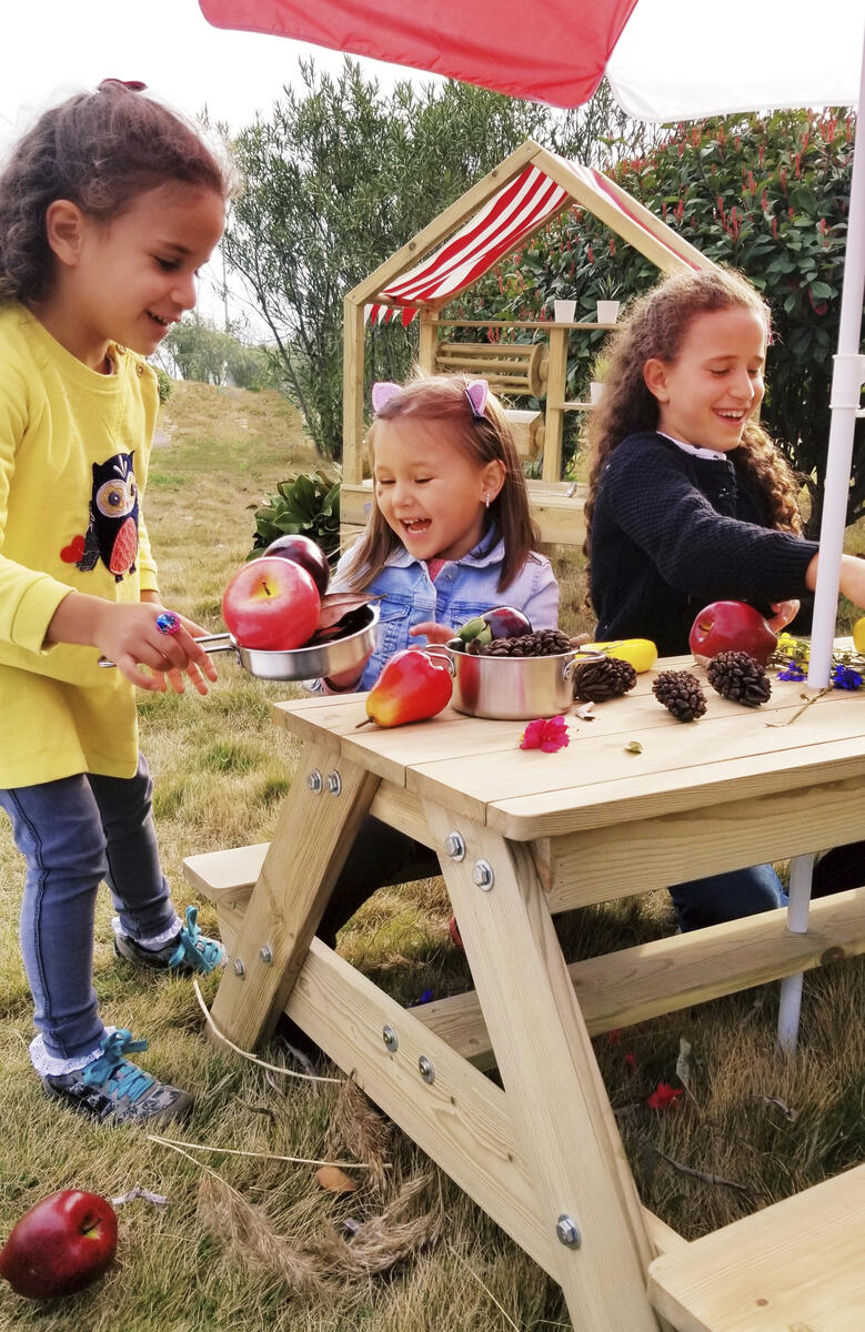 Et morsomt kjøkken utstyrt med egen vannpumpe, der barna utvikler sine kommunikasjonsevner mens de trener i et ekte kjøkkenmiljø. Vann er noe som fascinerer barn, og dette produktet gir store muligheter for utendørs læring. Pumpemekanisme som er enkel å bruke, plastbalje og kjøkketilbehør er med i dette komplette settet. Kjøkkenet er laget av impregnert furu. Levert umontert. Mål: L50xB69xH102 cm. Fra 3 år. Beregnet på utendørs bruk.