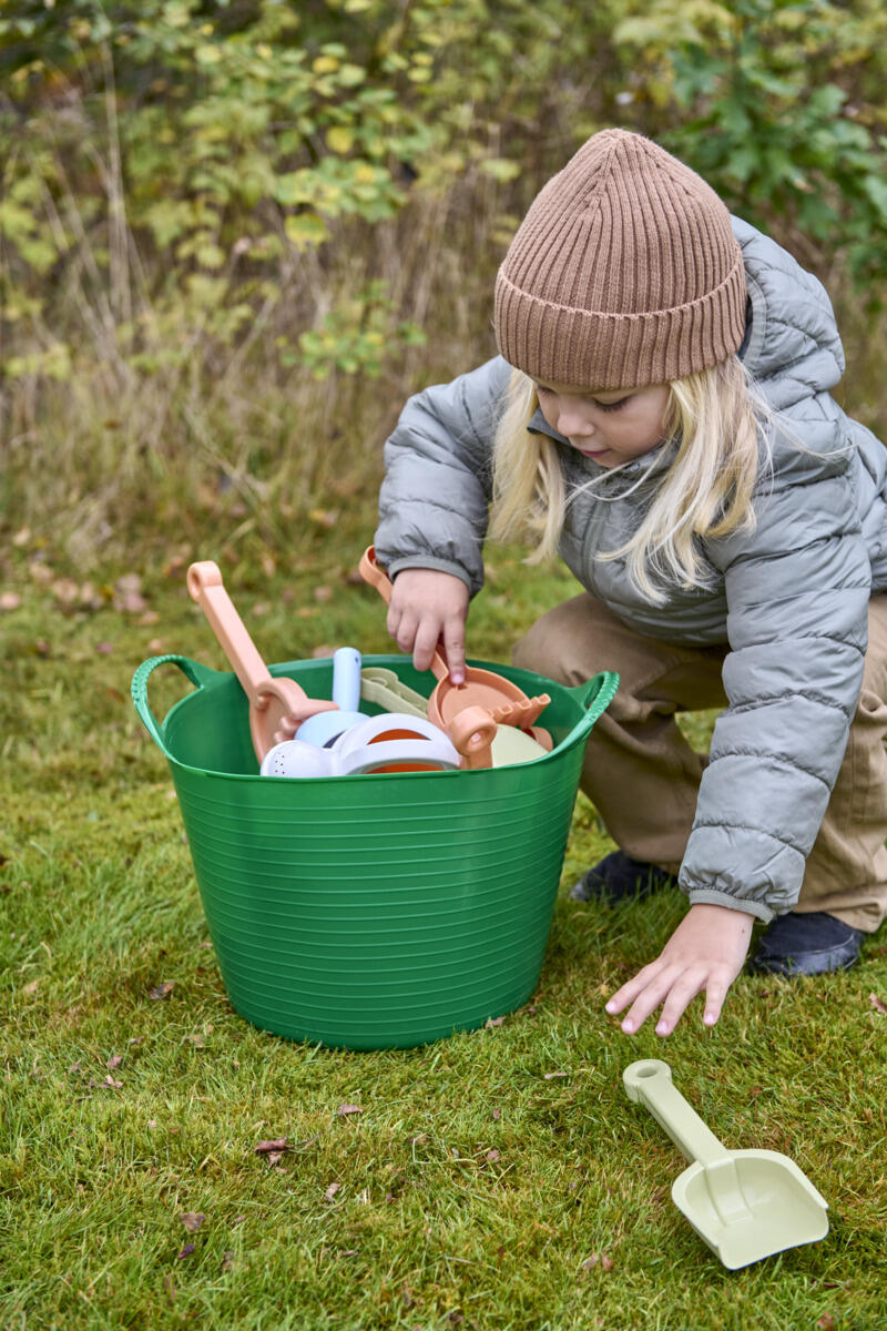 En enormt slitesterk, smidig og allsidig oppbevaringskurv som er ideell for en rekke forskjellige bruksområder i utemiljøet. Oppbevaringskurven er utstyrt med 2 håndtak som gjør den enkel å bære og flytte, noe som bidrar til et organisert og effektivt utemiljø. Denne lave og brede kurven egner seg ekstra godt for ulike undersøkende og eksperimenterende aktiviteter. Samle inn naturmaterialer, bruk den ved planting og dyrking, eller fyll den med vann, jord, grus, sand og vask den enkelt av igjen. Laget av resirkulert, UV-bestandig, frostsikker og næringsmiddelgodkjent LDPE-plast.