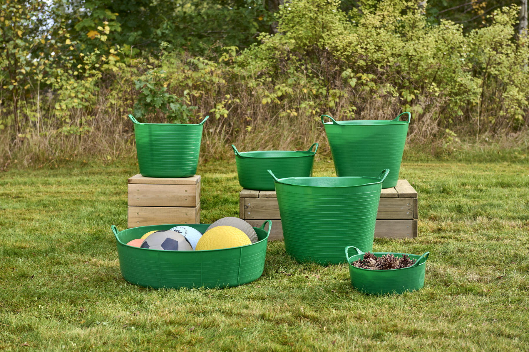 En enormt slitesterk, smidig og allsidig oppbevaringskurv som er ideell for en rekke forskjellige bruksområder i utemiljøet. Oppbevaringskurven er utstyrt med 2 håndtak som gjør den enkel å bære og flytte, noe som bidrar til et organisert og effektivt utemiljø. Denne lave og brede kurven egner seg ekstra godt for ulike undersøkende og eksperimenterende aktiviteter. Samle inn naturmaterialer, bruk den ved planting og dyrking, eller fyll den med vann, jord, grus, sand og vask den enkelt av igjen. Laget av resirkulert, UV-bestandig, frostsikker og næringsmiddelgodkjent LDPE-plast.
