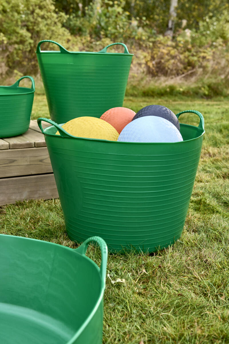 En enormt slitesterk, smidig og allsidig oppbevaringskurv som er ideell for en rekke forskjellige bruksområder i utemiljøet. Oppbevaringskurven er utstyrt med 2 håndtak som gjør den enkel å bære og flytte, noe som bidrar til et organisert og effektivt utemiljø. Denne lave og brede kurven egner seg ekstra godt for ulike undersøkende og eksperimenterende aktiviteter. Samle inn naturmaterialer, bruk den ved planting og dyrking, eller fyll den med vann, jord, grus, sand og vask den enkelt av igjen. Laget av resirkulert, UV-bestandig, frostsikker og næringsmiddelgodkjent LDPE-plast.