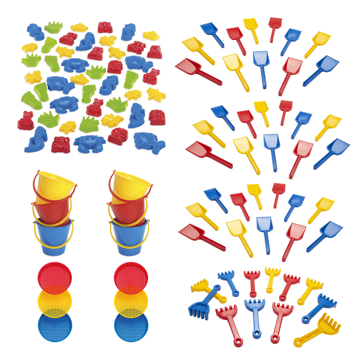 100 deler. Inneholder bøtter, spader, sandsil, raker, vannkanner sandmøller, byggebeger, kjøpmannsspader og sandformer i ulike størrelser. Polypropenplast. Svanemerket, lisensnummer 50950001. Tåler frost. Fra 2 år.