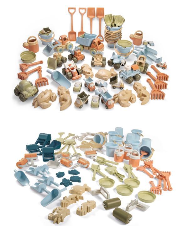 Et stort sett til sandkassen av god kvalitet i ulike farger. Laget av bioplast som er basert på sukkerrør og 100% resirkulerbart materiale. Tåler frost. Svanemerket, lisensnummer 50950001. PVC-fri. Tåler vask i oppvaskmaskin. Fra 2 år.