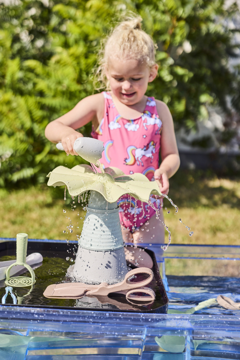Et stort sett til sandkassen av god kvalitet i ulike farger. Laget av bioplast som er basert på sukkerrør og 100% resirkulerbart materiale. Tåler frost. Svanemerket, lisensnummer 50950001. PVC-fri. Tåler vask i oppvaskmaskin. Fra 2 år.