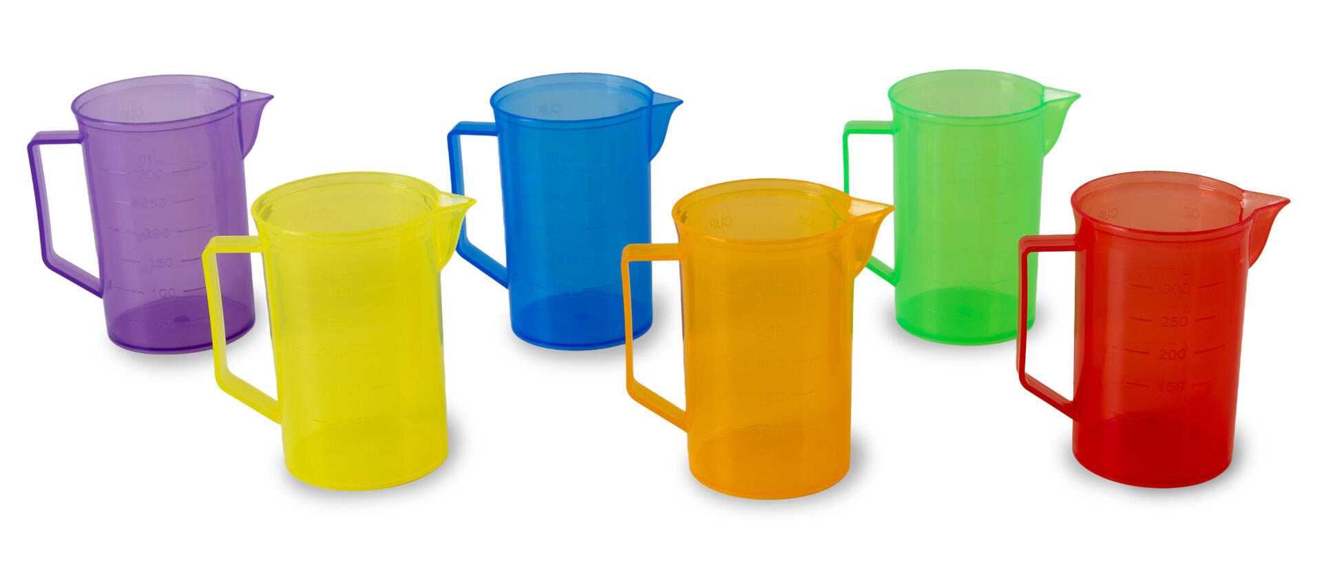6 stk/pk. Transparent fargede beger som er passe store å håndtere for barn. Gradert 50-300 ml. Kan brukes til eksperiment, måling og vannlek. 6 ulike farger. Av ABS. Mål: 11,3x7,7 cm. Fra 1,5 år.