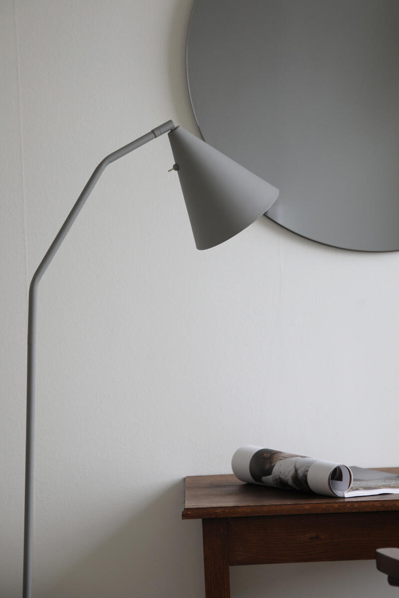 En elegant gulvlampe i stilren og moderne design som passer inn i både minimalistiske og mer uttrykksfulle miljøer. Lampen er laget av lakkert metall og har et dekorativt, kjegleformet lampehode som både kan roteres og vippes for å gi et rettet og funksjonelt lys. Lampen har en innebygd strømbryter på baksiden av skjermen og en 3-trinns dimmer med minnefunksjon som alltid starter på sist brukte lysstyrke. Maks watt: 4,9 W. Sokkel: Fast 3-trinns dimbar LED, 100 % 450 lm, 75 % 225 lm og 50 % 135 lm. Varmhvit fargetemperatur 3000 K. 2 m transparent ledning med veggkontakt. LED-modulen er utskiftbar. IP-klasse: IP20. Sikkerhetsklasse: Klasse II.