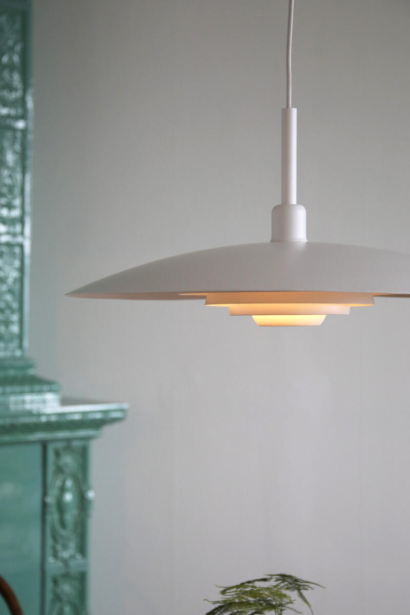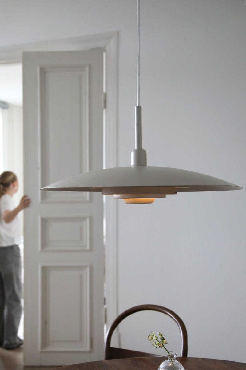 Taklampen har skjerm og takskål i lakkert metall. Formspråket kan minne om en klassisk heislampen, men med et mer moderne og stilrent uttrykk. Armaturen har ikke innebygd dimmerfunksjon, men kan dimmes med en dimbar lyskilde. Maks watt: 40 W. Sokkel: E27. 1,5 m tekstilledning. For krokoppheng. Lyskilde følger ikke med. IP-klasse: IP20. Sikkerhetsklasse: Klasse I.