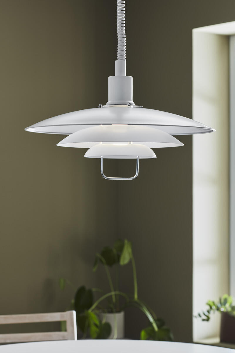 Pendellampe i aluminium. Kan justeres i høyden 0,8-1,9 m. Armaturen har ikke innebygd dimmerfunksjon, men kan dimmes med en dimbar lyskilde. Bredde 48 cm, høyde 28 cm. Maks watt: 60 W. Sokkel: E27. Ledning 2 m. Krokoppheng. Lyskilde følger ikke med. IP-klasse: IP20. Sikkerhetsklasse: Klasse II.