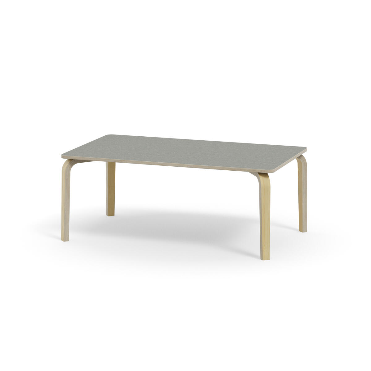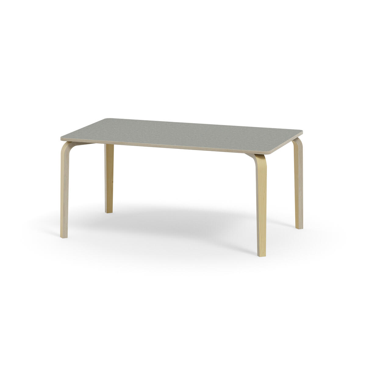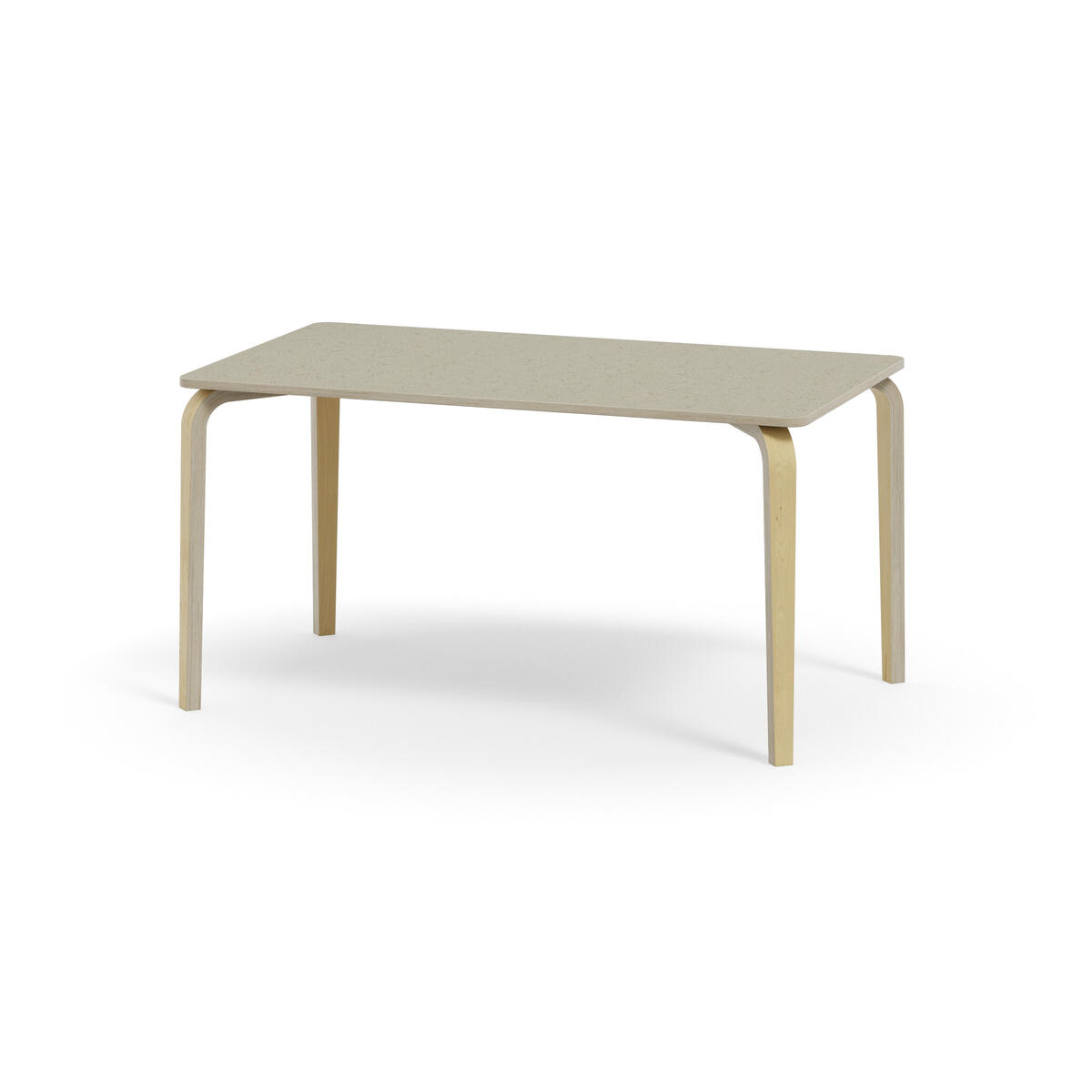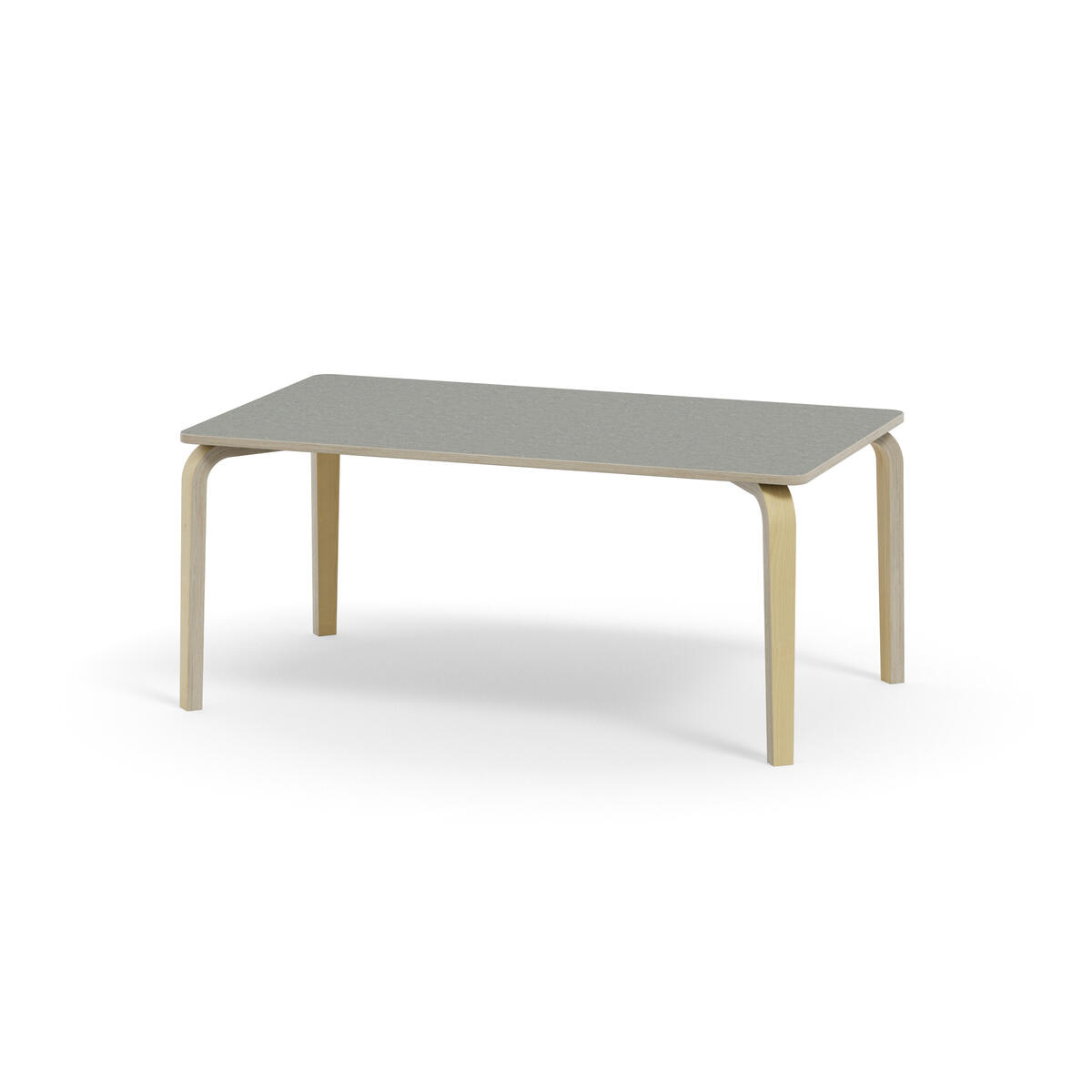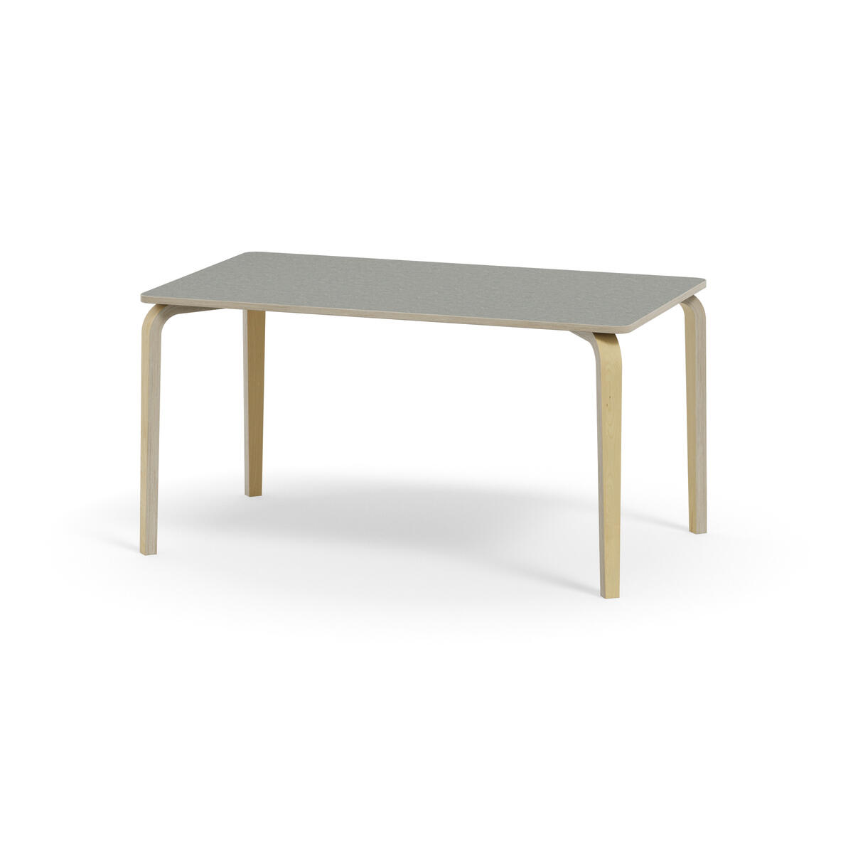 Arcus en bordserie uten ramme på bordplaten, som skaper mer plass til bena. Overflaten er dekket med linoleum. Hjørneradius på 40 mm. Bordben i hvitpigmentert bjørkekryssfiner med utadgående vinkel og avsmalnende form nedover benet.