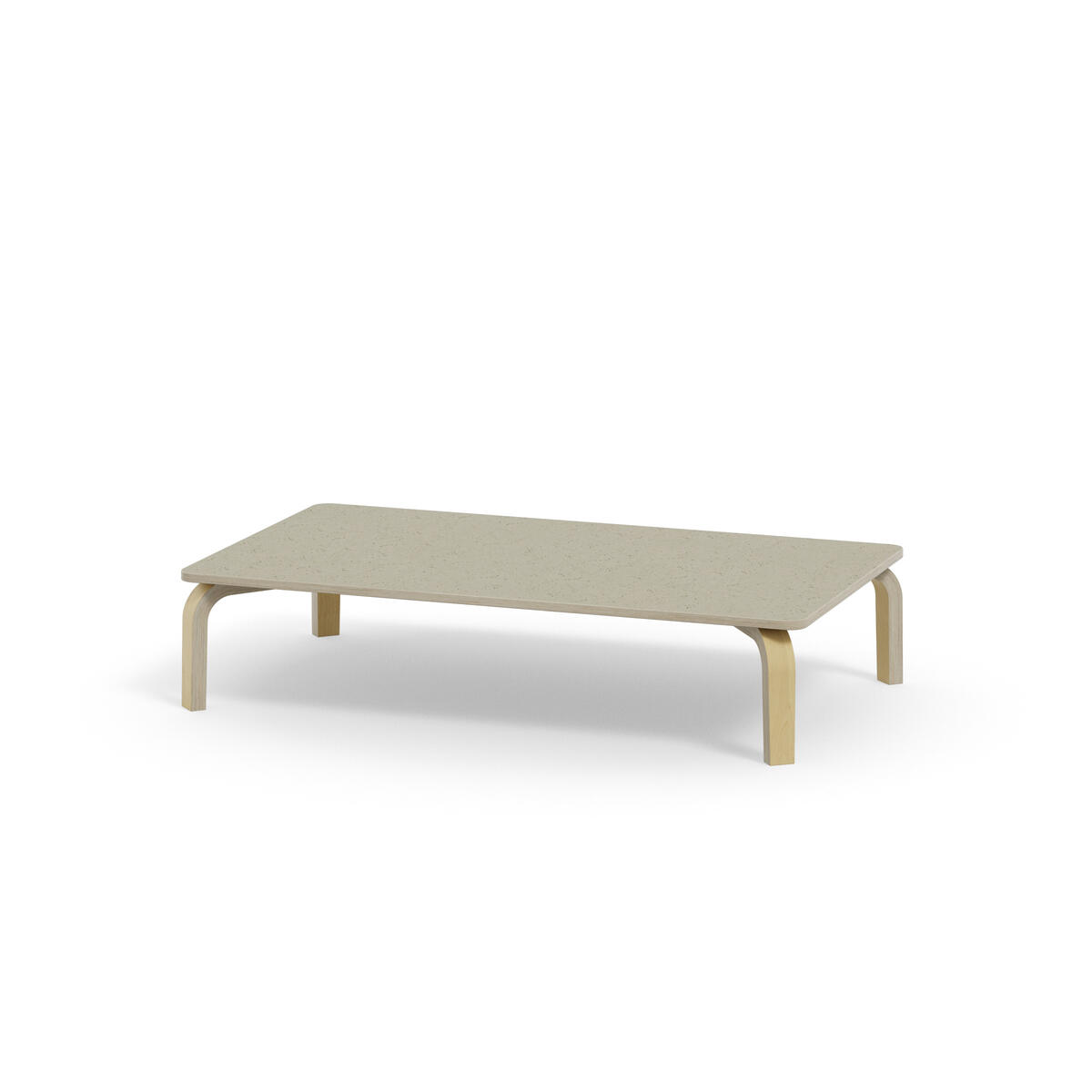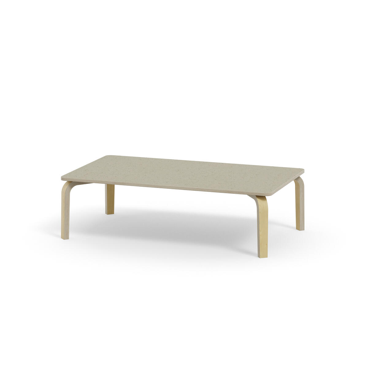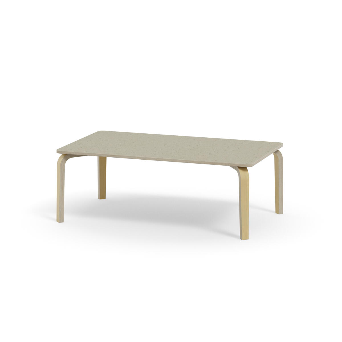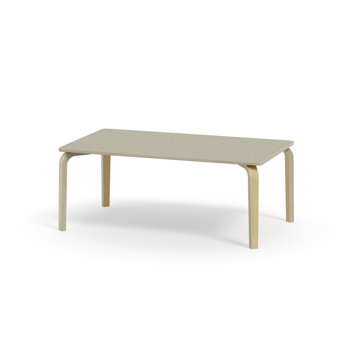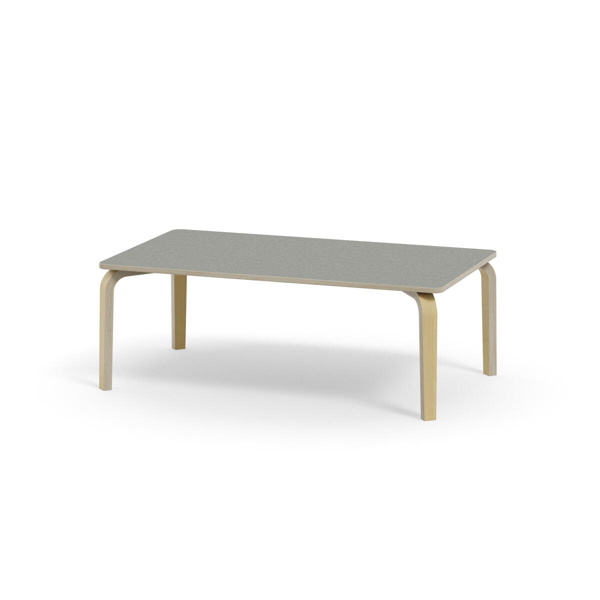 Arcus en bordserie uten ramme på bordplaten, som skaper mer plass til bena. Overflaten er dekket med linoleum. Hjørneradius på 40 mm. Bordben i hvitpigmentert bjørkekryssfiner med utadgående vinkel og avsmalnende form nedover benet.