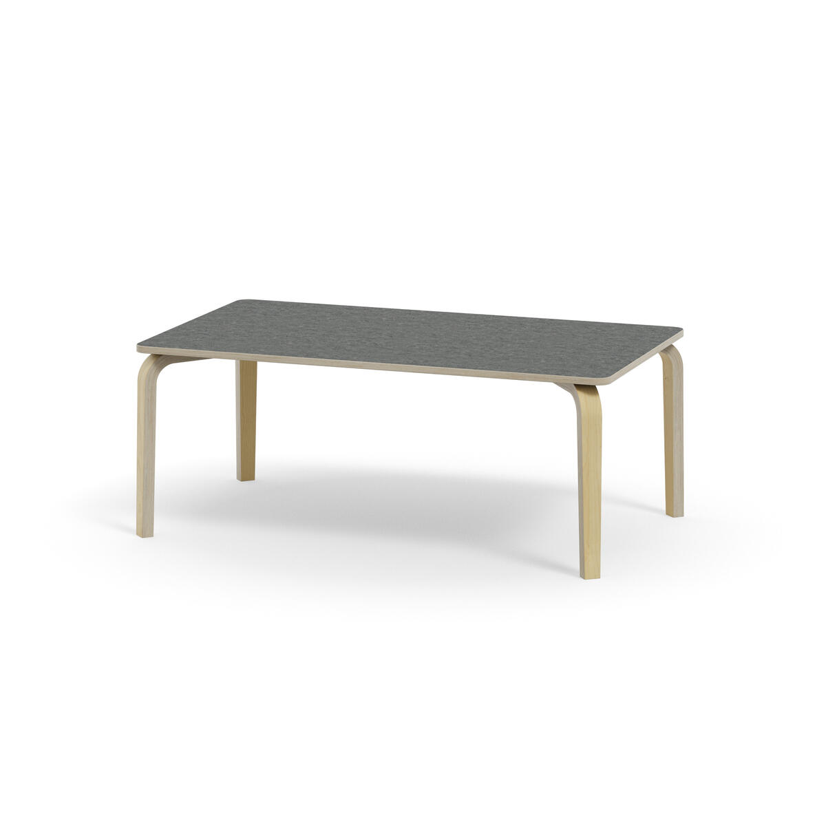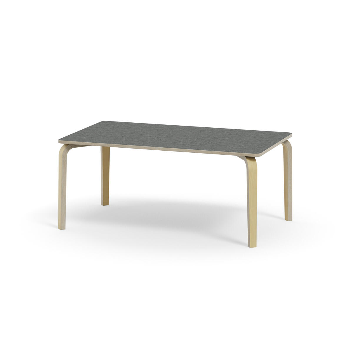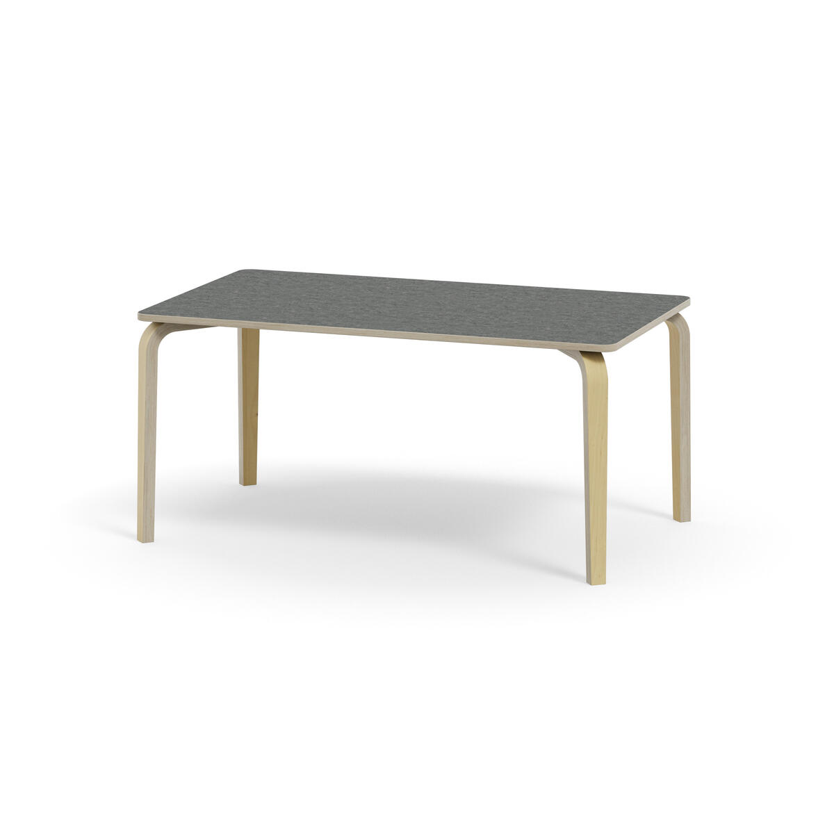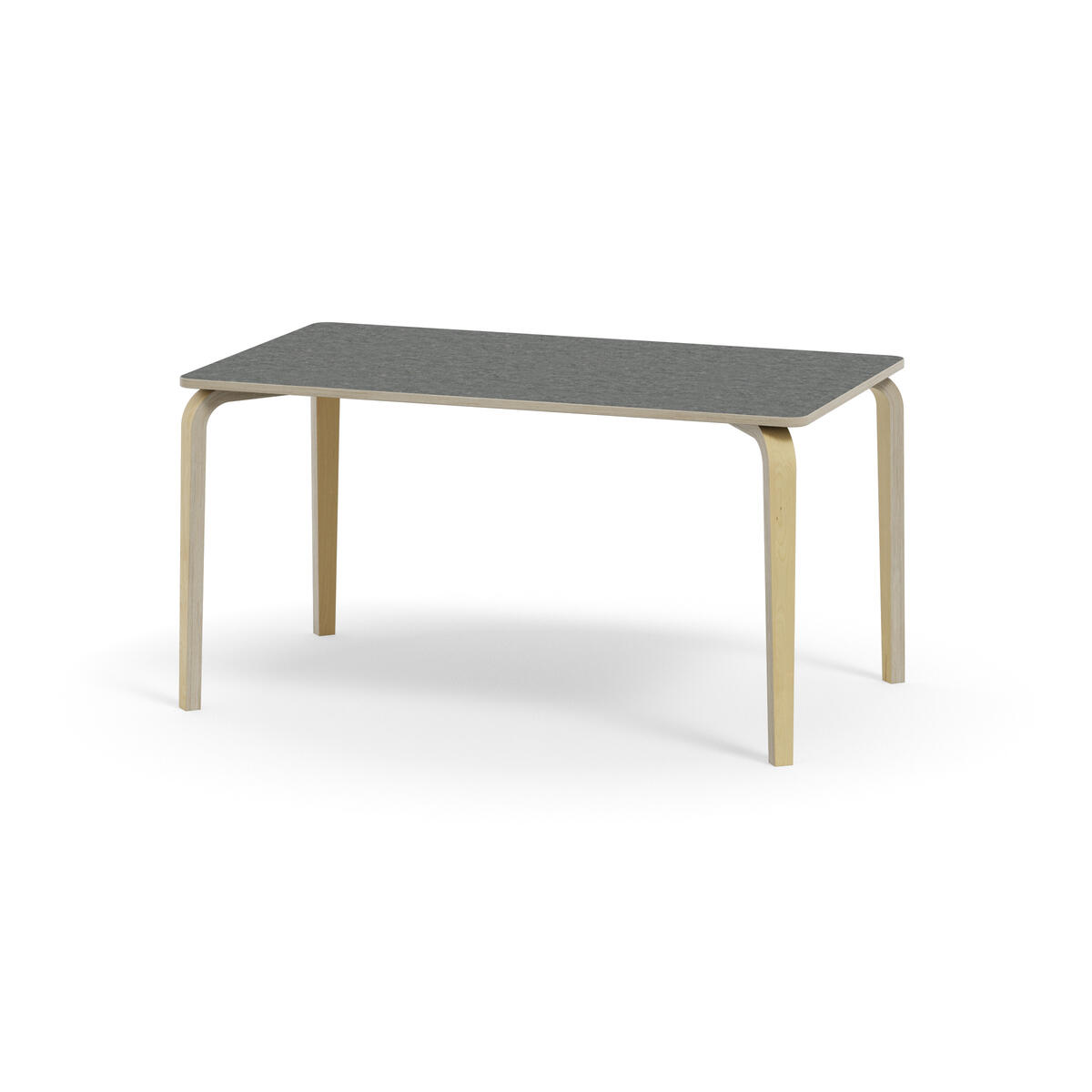 Arcus en bordserie uten ramme på bordplaten, som skaper mer plass til bena. Overflaten er dekket med linoleum. Hjørneradius på 40 mm. Bordben i bjørkekryssfiner med utadgående vinkel og avsmalnende form nedover benet.