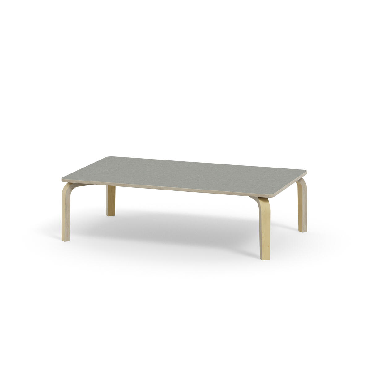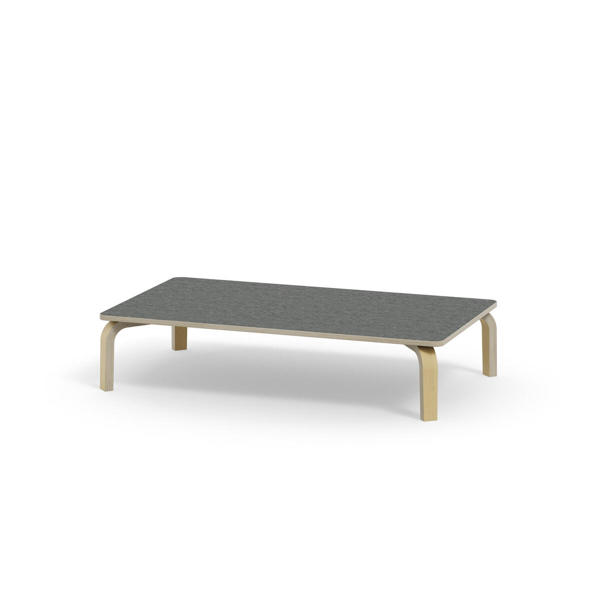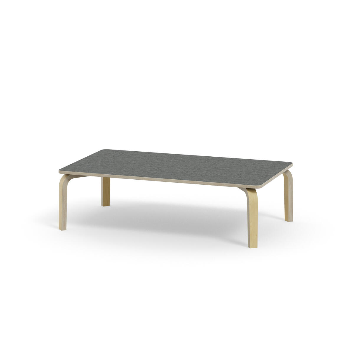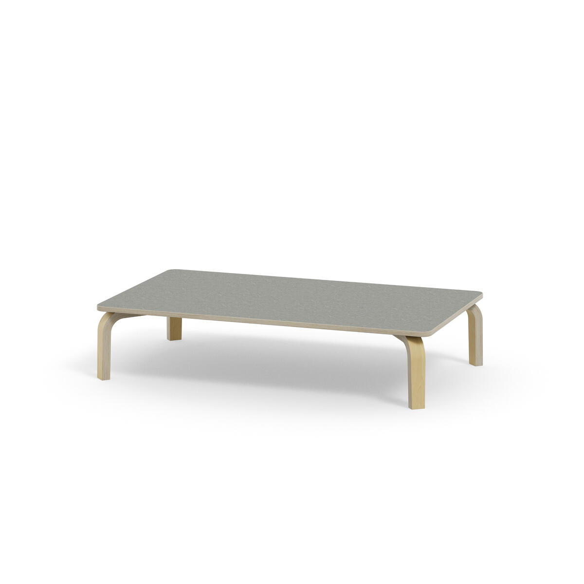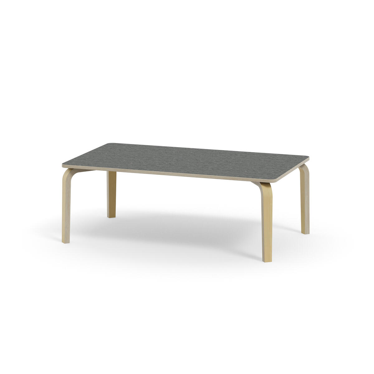 Arcus en bordserie uten ramme på bordplaten, som skaper mer plass til bena. Overflaten er dekket med linoleum. Hjørneradius på 40 mm. Bordben i bjørkekryssfiner med utadgående vinkel og avsmalnende form nedover benet.