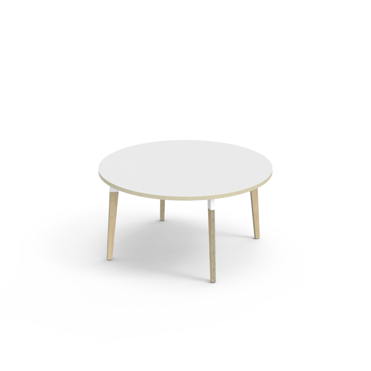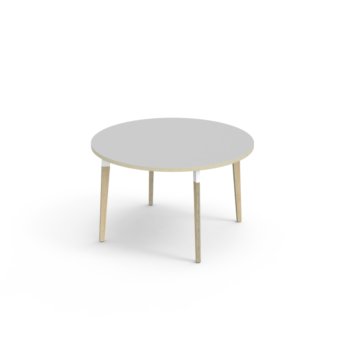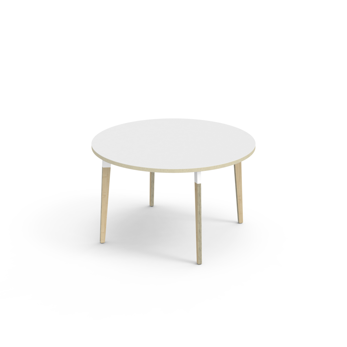 Bordplate belagt med høytrykkslaminat som gir en slitesterk overflate. Bordet har en hjørneradius på 40 mm og har et moderne og stilrent design. Bena har en rektangulær form og er laget av klarlakkert bjørkekryssfiner montert i en robust, hvit metallmansjett. Denne konstruksjonen sikrer både stabilitet og holdbarhet. Bena er lett vinklet mot hjørnene av bordplaten, noe som gir bordet et unikt og estetisk tiltalende utseende. Monteringen er enkel og lett - du trenger bare å feste metallhylsene til festepunktene i bordplaten.