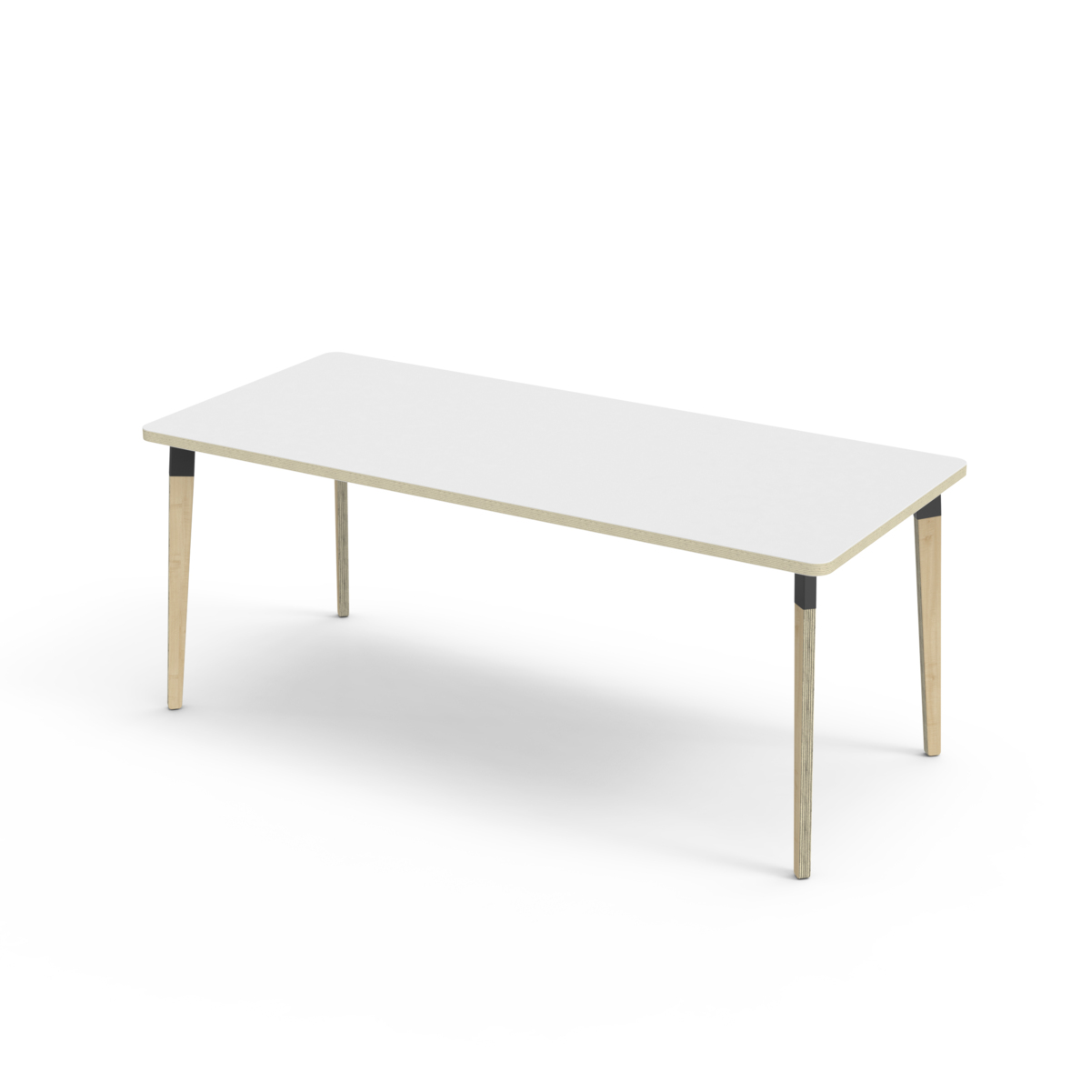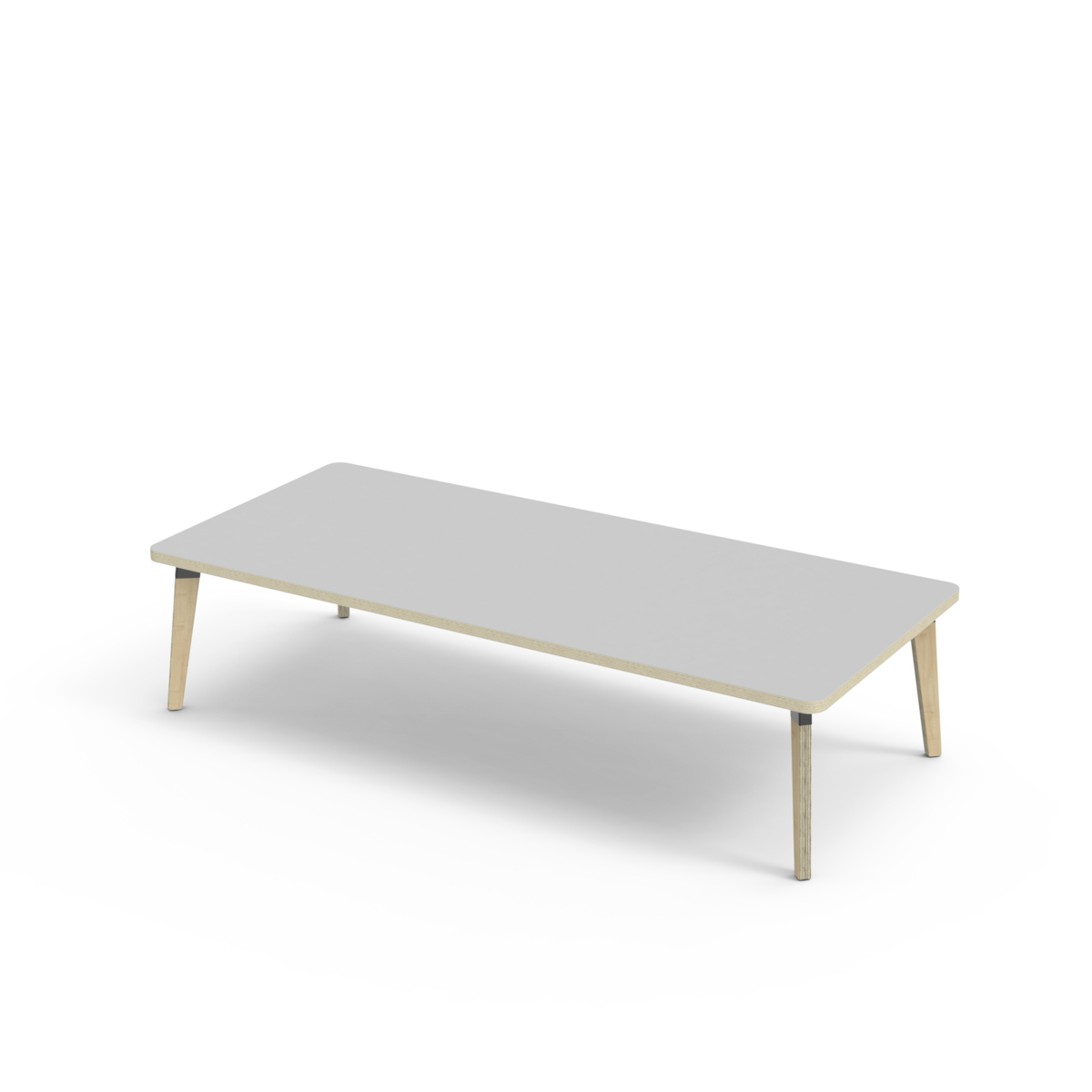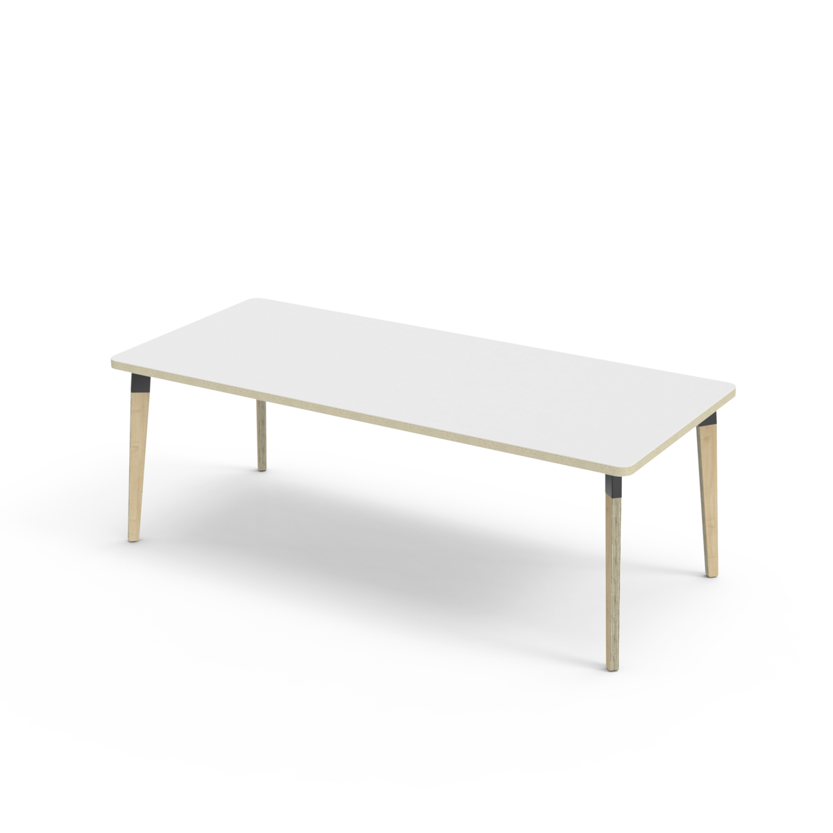 Lydabsorberende bordplate belagt med høytrykkslaminat, noe som gir en slitesterk overflate. Bordet har en hjørneradius på 40 mm og har et moderne og stilrent design. Bena har en rektangulær form og er laget av klarlakkert bjørkekryssfiner montert i en robust, hvit metallmansjett. Denne konstruksjonen sikrer både stabilitet og holdbarhet. Bena er lett vinklet mot hjørnene av bordplaten, noe som gir bordet et unikt og estetisk tiltalende utseende. Monteringen er enkel og lett - du trenger bare å feste metallhylsene til festepunktene i bordplaten.