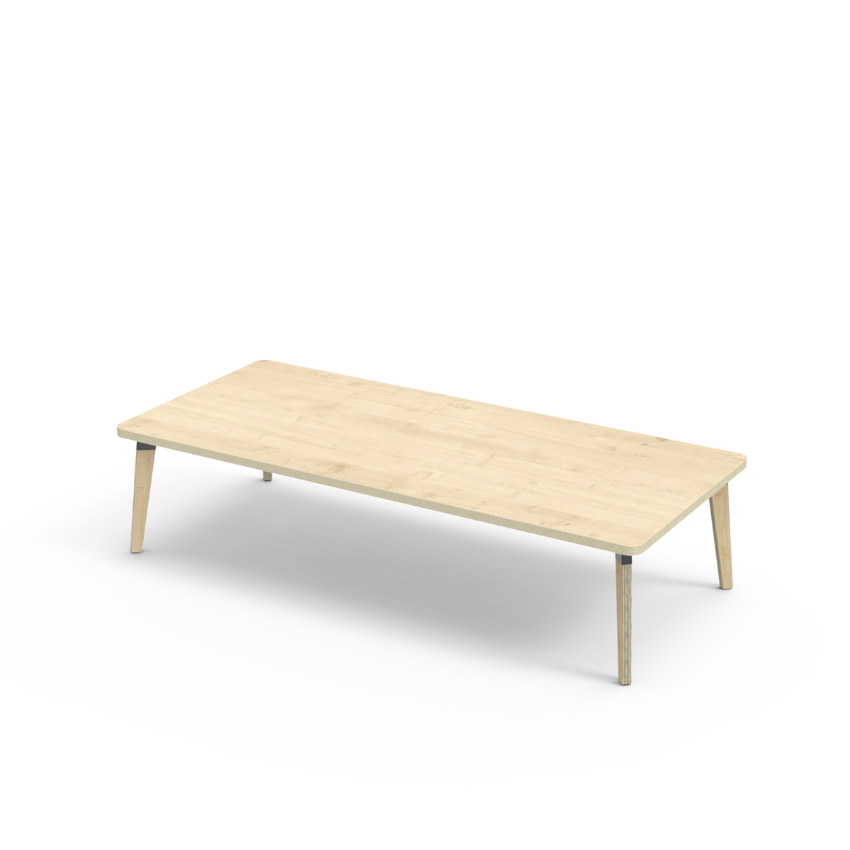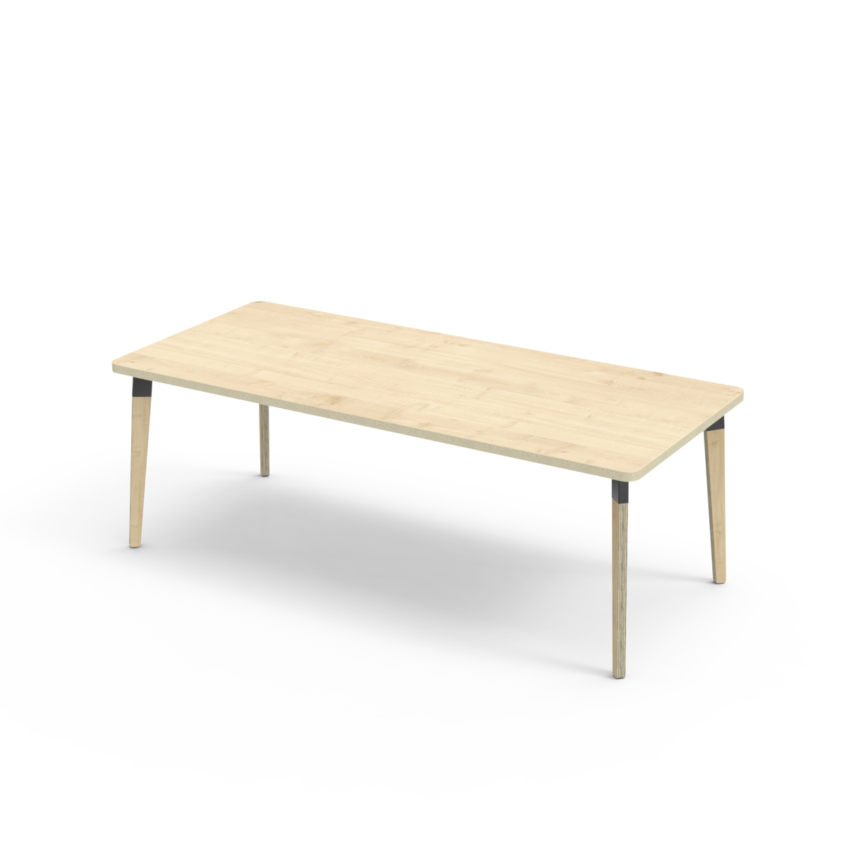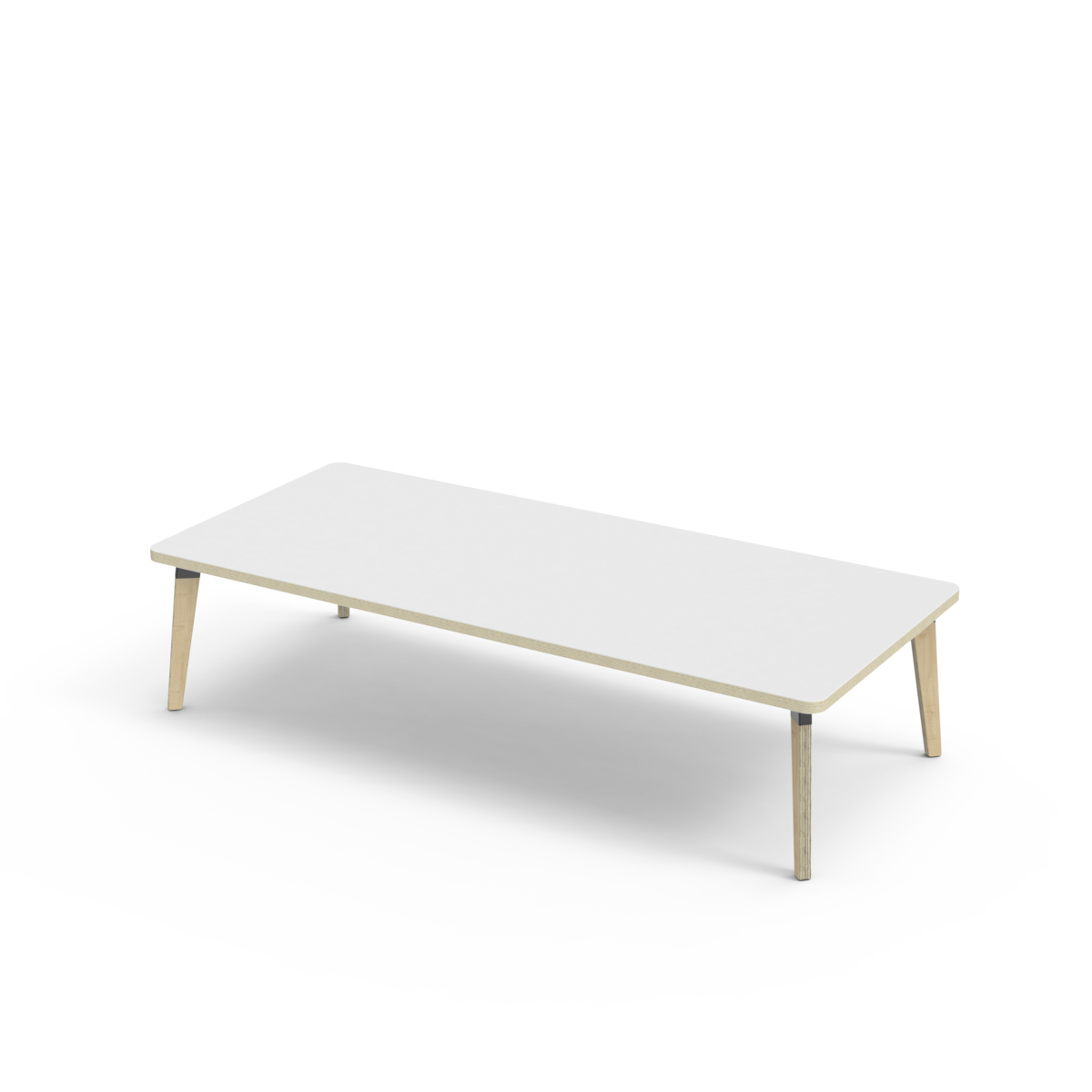 Lydabsorberende bordplate belagt med høytrykkslaminat, noe som gir en slitesterk overflate. Bordet har en hjørneradius på 40 mm og har et moderne og stilrent design. Bena har en rektangulær form og er laget av klarlakkert bjørkekryssfiner montert i en robust, hvit metallmansjett. Denne konstruksjonen sikrer både stabilitet og holdbarhet. Bena er lett vinklet mot hjørnene av bordplaten, noe som gir bordet et unikt og estetisk tiltalende utseende. Monteringen er enkel og lett - du trenger bare å feste metallhylsene til festepunktene i bordplaten.