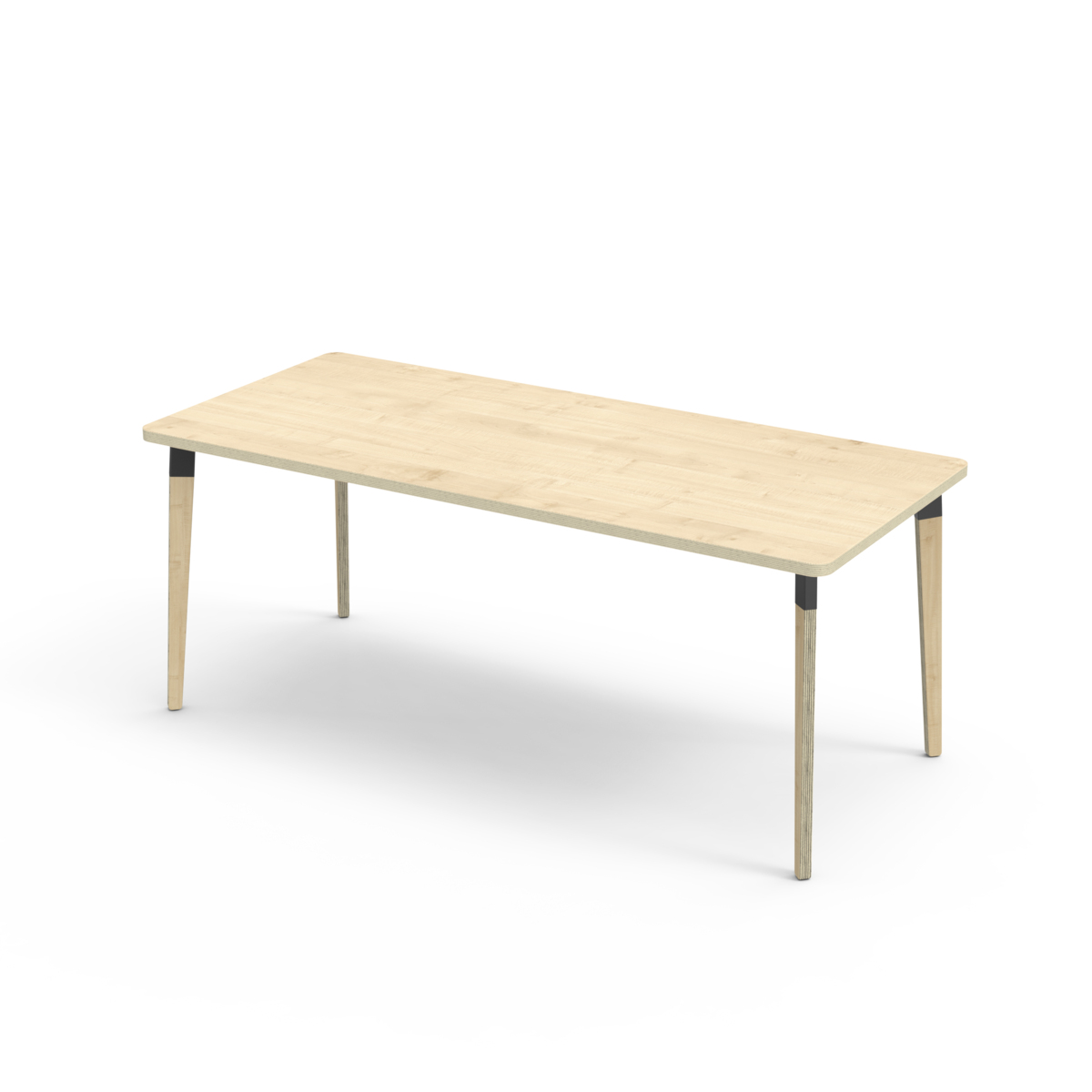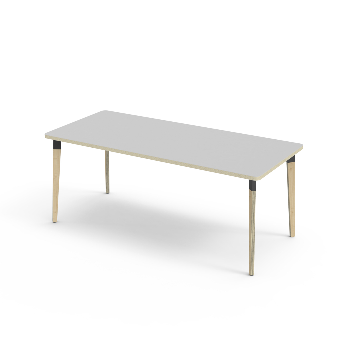 Bordplate belagt med laminat. Bordet har en hjørneradius på 40 mm og har et moderne og stilrent design. Bena har en rektangulær form og er laget av klarlakkert bjørkekryssfiner montert i en robust, svart metallmansjett. Denne konstruksjonen sikrer både stabilitet og holdbarhet. Bena er lett vinklet mot hjørnene av bordplaten, noe som gir bordet et unikt og estetisk tiltalende utseende. Monteringen er enkel og lett - du trenger bare å feste metallhylsene til festepunktene i bordplaten.