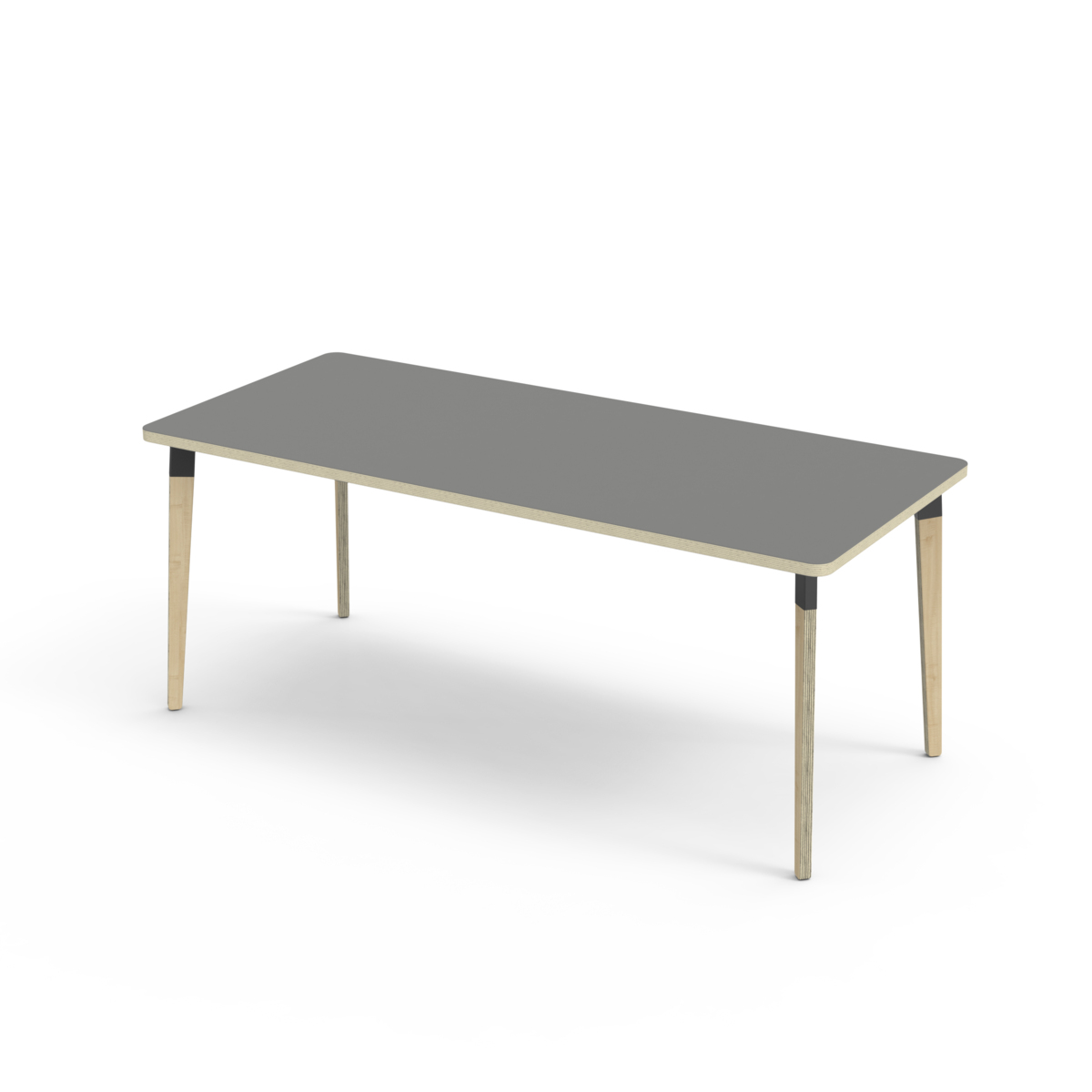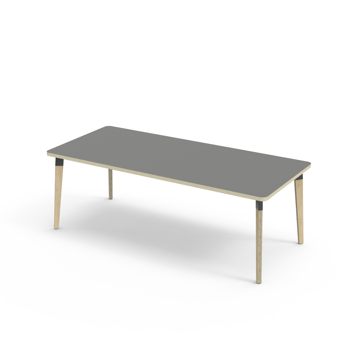 Bordplate belagt med akustikk linoleum, som gir en myk og behagelig overflate samtidig som den bidrar til et bedre lydmiljø. Bordet har en hjørneradius på 40 mm og har et moderne og stilrent design. Bena har en rektangulær form og er laget av klarlakkert bjørkekryssfiner montert i en robust, svart metallmansjett. Denne konstruksjonen sikrer både stabilitet og holdbarhet. Bena er lett vinklet mot hjørnene av bordplaten, noe som gir bordet et unikt og estetisk tiltalende utseende. Monteringen er enkel og lett - du trenger bare å feste metallhylsene til festepunktene i bordplaten.
