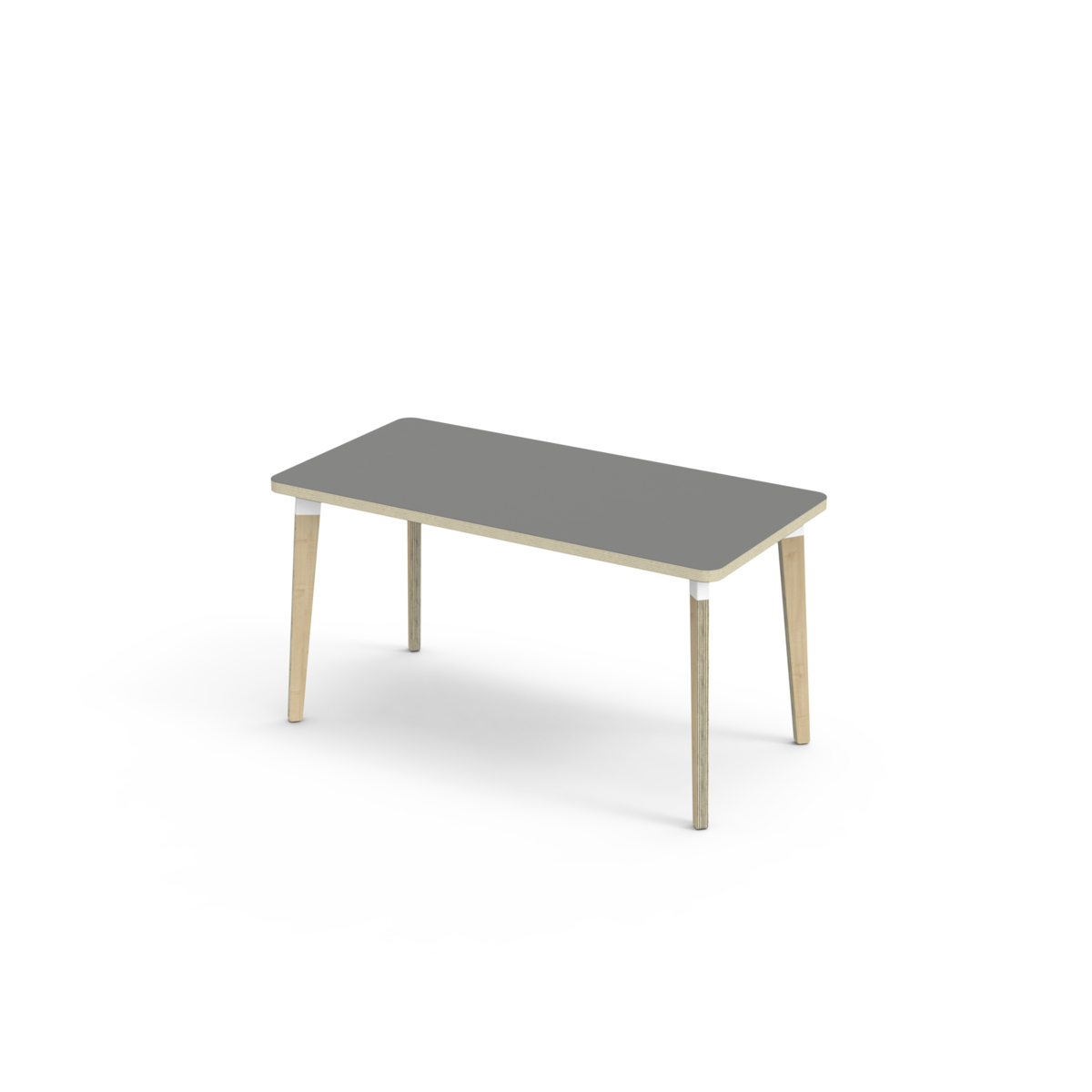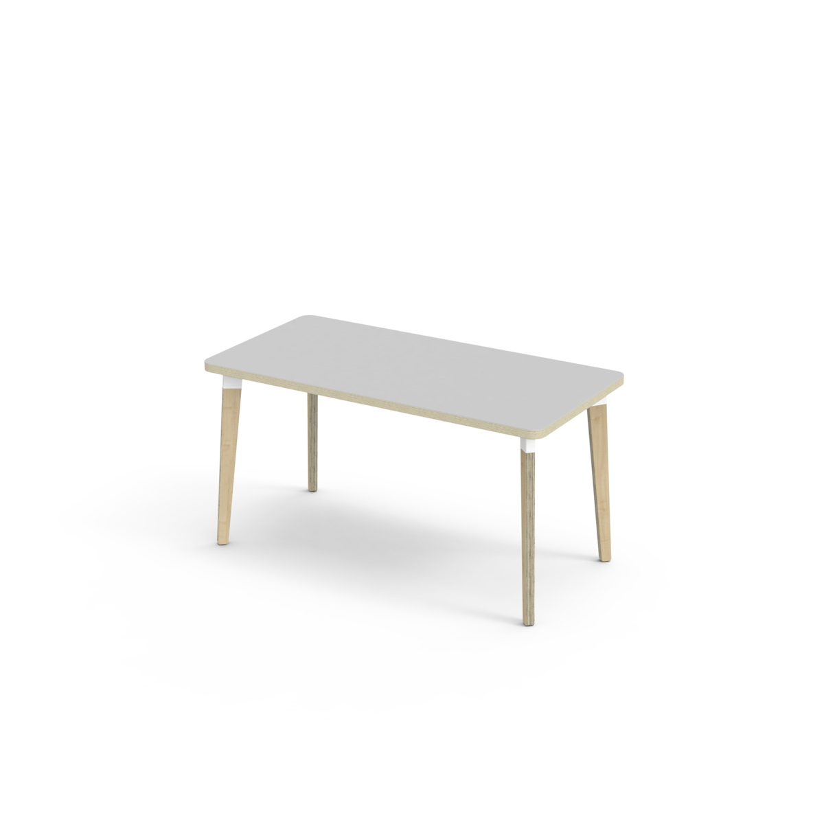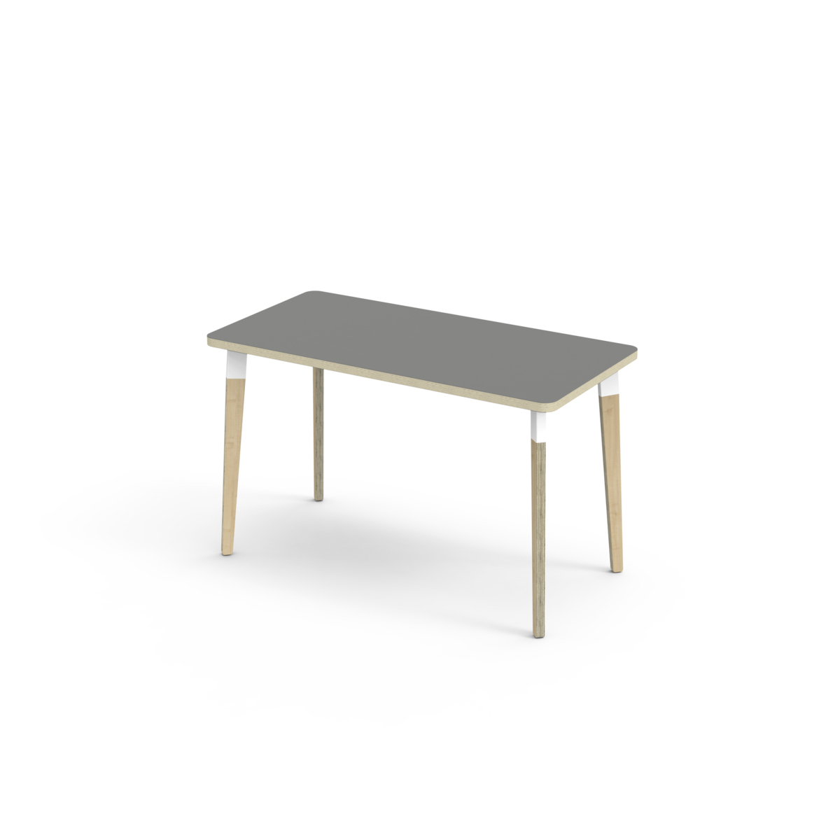 Bordplate belagt med høytrykkslaminat som gir en slitesterk overflate. Bordet har en hjørneradius på 40 mm og har et moderne og stilrent design. Bena har en rektangulær form og er laget av klarlakkert bjørkekryssfiner montert i en robust, hvit metallmansjett. Denne konstruksjonen sikrer både stabilitet og holdbarhet. Bena er lett vinklet mot hjørnene av bordplaten, noe som gir bordet et unikt og estetisk tiltalende utseende. Monteringen er enkel og lett - du trenger bare å feste metallhylsene til festepunktene i bordplaten.