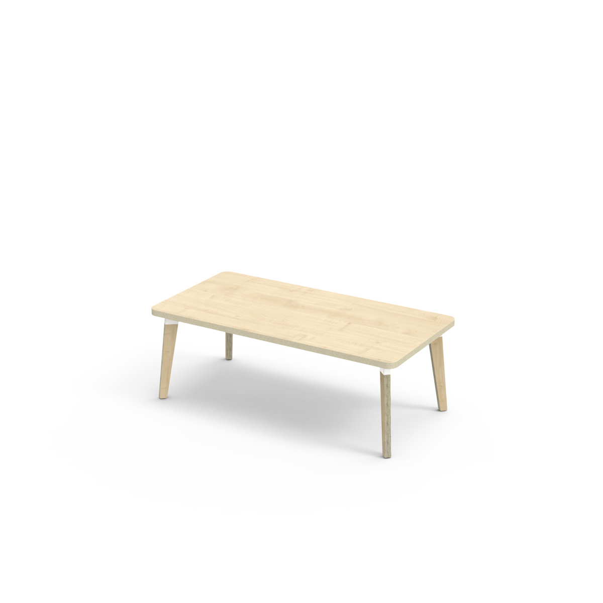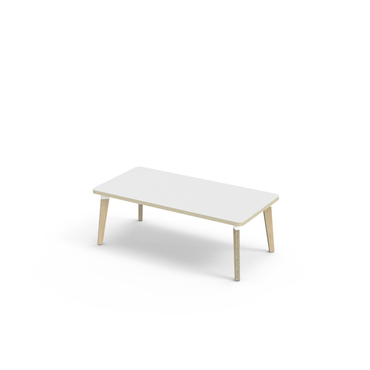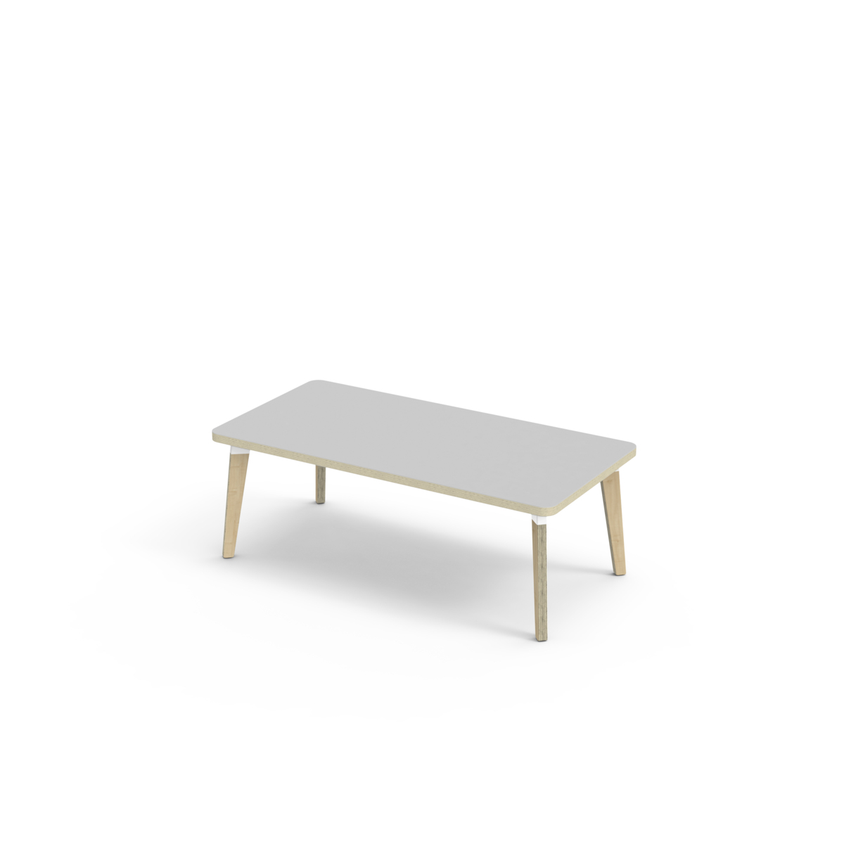 Bordplate belagt med høytrykkslaminat som gir en slitesterk overflate. Bordet har en hjørneradius på 40 mm og har et moderne og stilrent design. Bena har en rektangulær form og er laget av klarlakkert bjørkekryssfiner montert i en robust, hvit metallmansjett. Denne konstruksjonen sikrer både stabilitet og holdbarhet. Bena er lett vinklet mot hjørnene av bordplaten, noe som gir bordet et unikt og estetisk tiltalende utseende. Monteringen er enkel og lett - du trenger bare å feste metallhylsene til festepunktene i bordplaten.