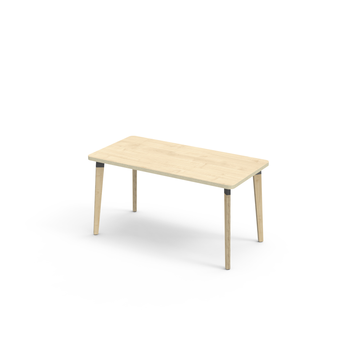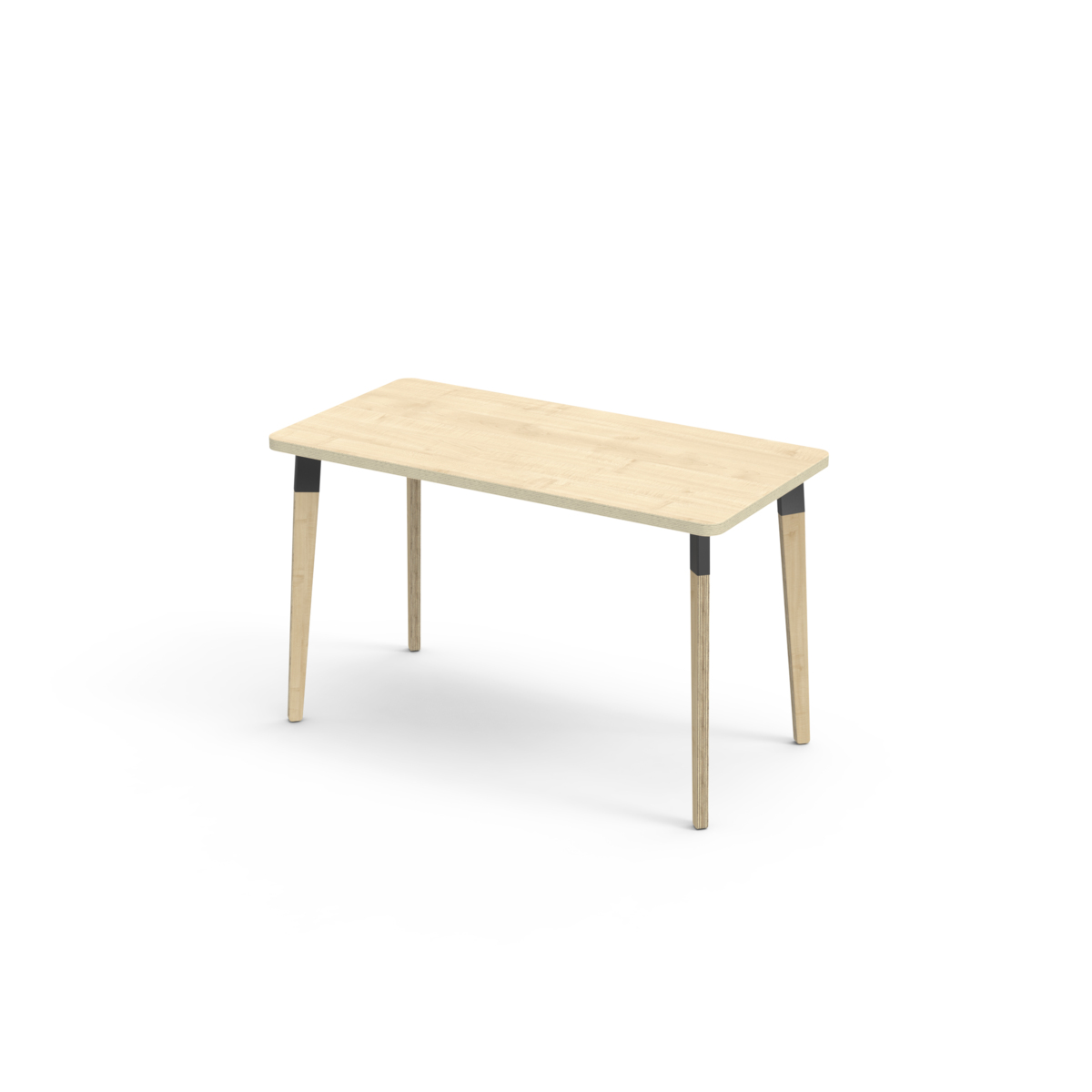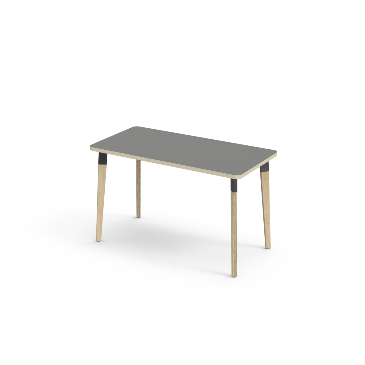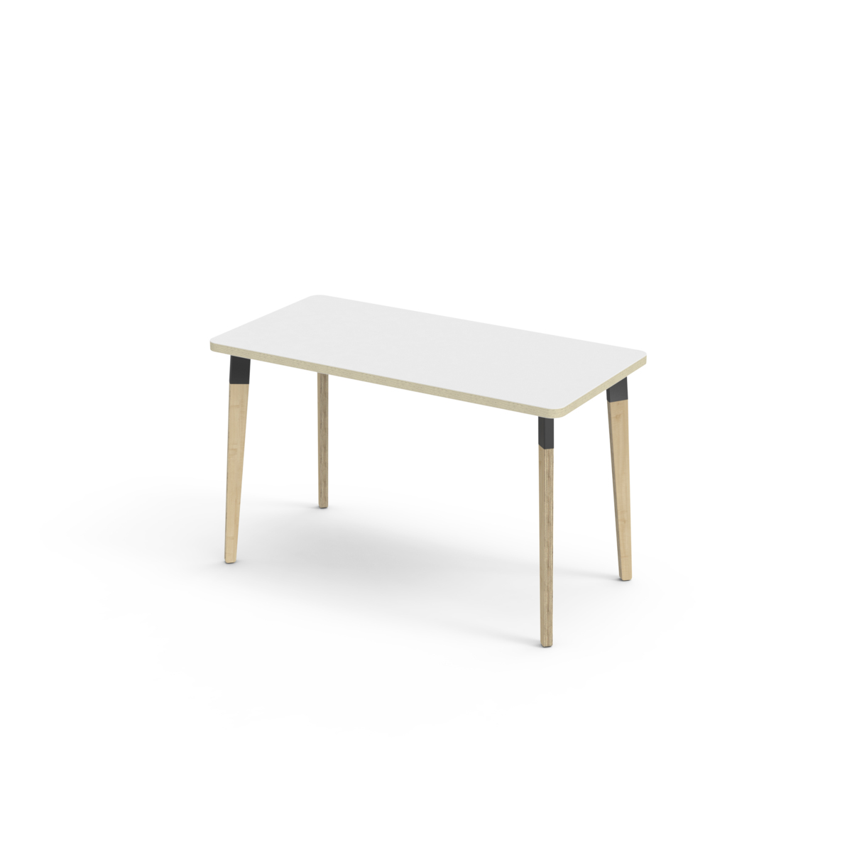 Bordplate belagt med laminat. Bordet har en hjørneradius på 40 mm og har et moderne og stilrent design. Bena har en rektangulær form og er laget av klarlakkert bjørkekryssfiner montert i en robust, svart metallmansjett. Denne konstruksjonen sikrer både stabilitet og holdbarhet. Bena er lett vinklet mot hjørnene av bordplaten, noe som gir bordet et unikt og estetisk tiltalende utseende. Monteringen er enkel og lett - du trenger bare å feste metallhylsene til festepunktene i bordplaten.
