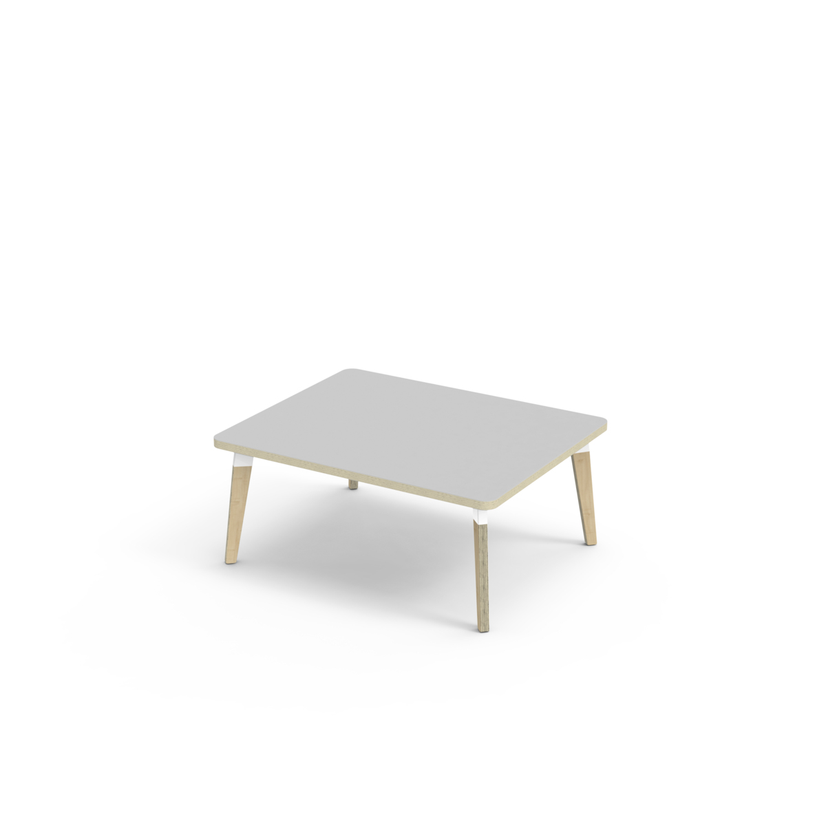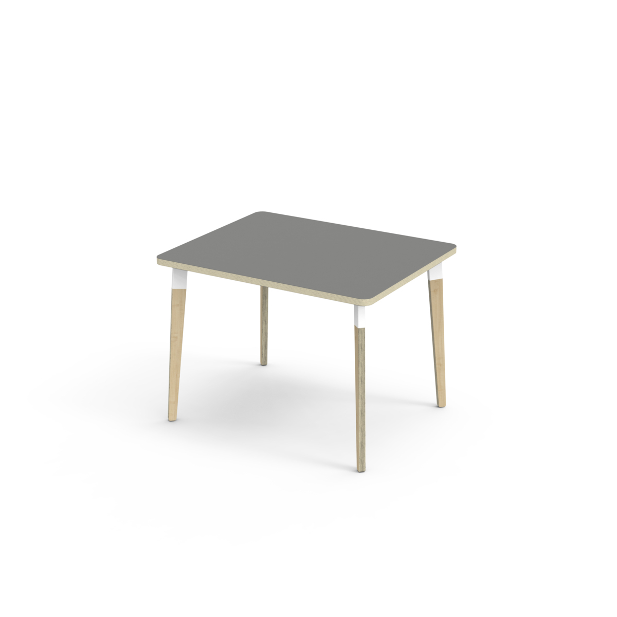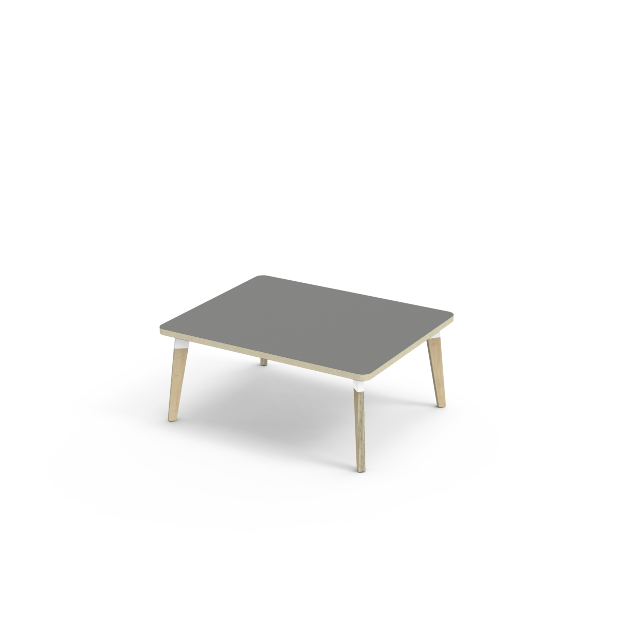 Lydabsorberende bordplate belagt med høytrykkslaminat, noe som gir en slitesterk overflate. Bordet har en hjørneradius på 40 mm og har et moderne og stilrent design. Bena har en rektangulær form og er laget av klarlakkert bjørkekryssfiner montert i en robust, hvit metallmansjett. Denne konstruksjonen sikrer både stabilitet og holdbarhet. Bena er lett vinklet mot hjørnene av bordplaten, noe som gir bordet et unikt og estetisk tiltalende utseende. Monteringen er enkel og lett - du trenger bare å feste metallhylsene til festepunktene i bordplaten.