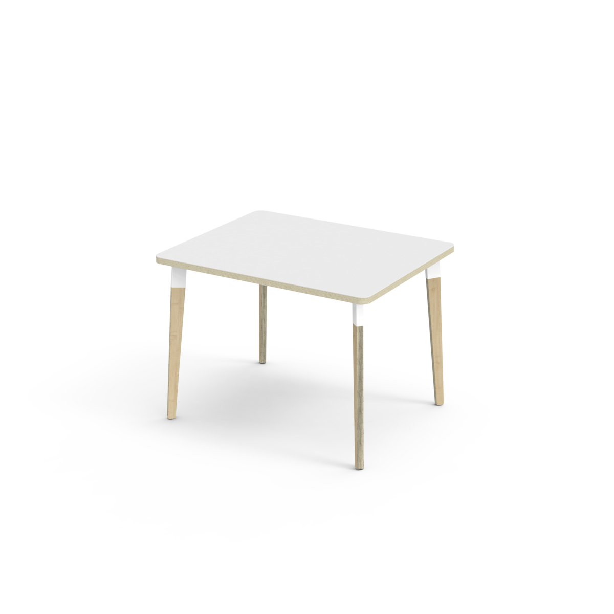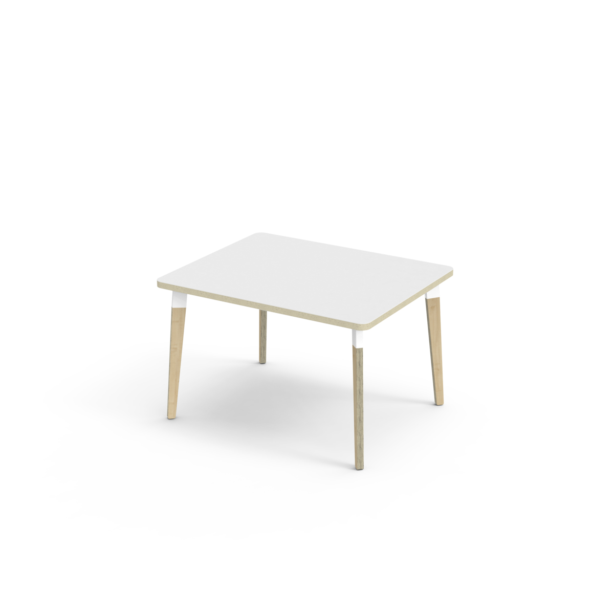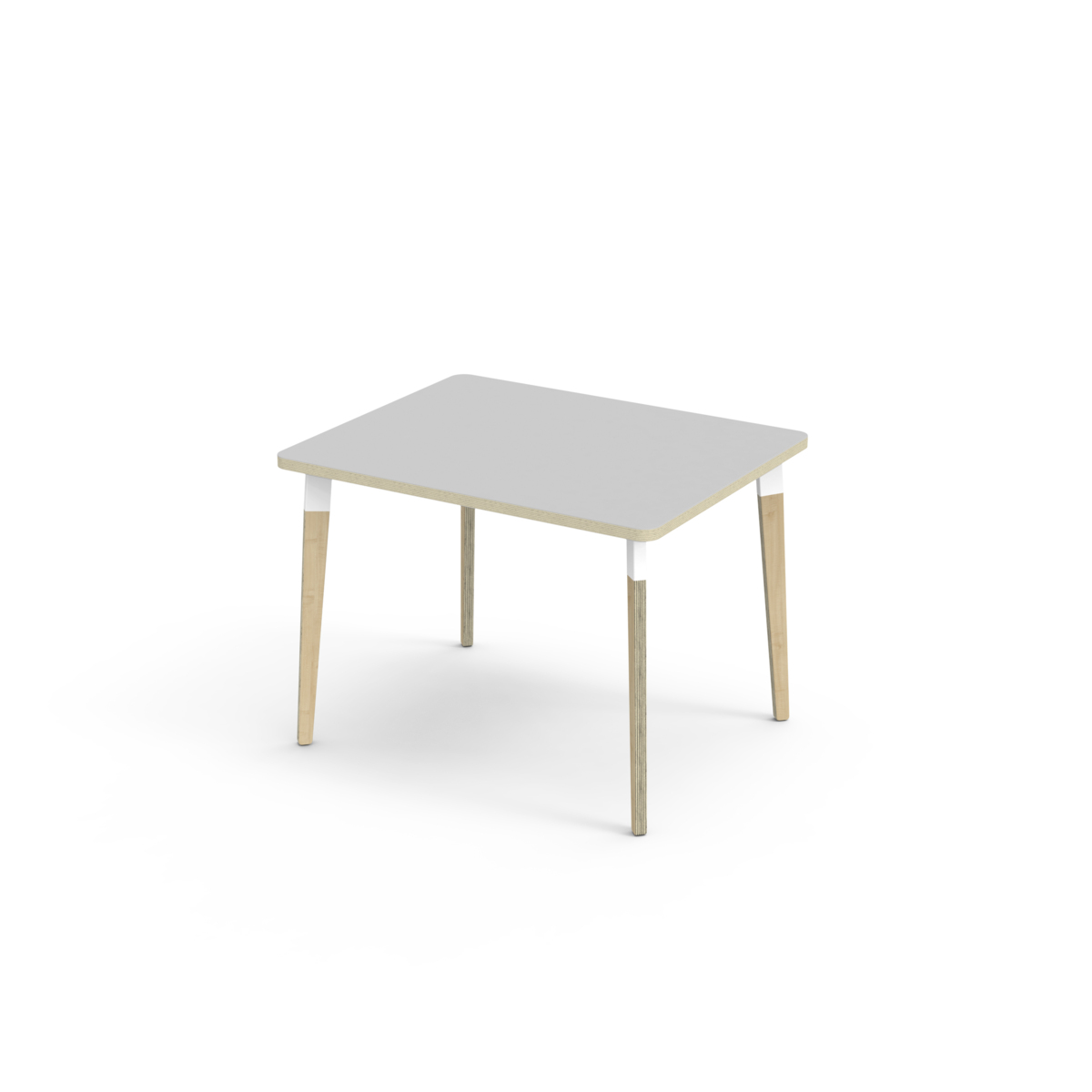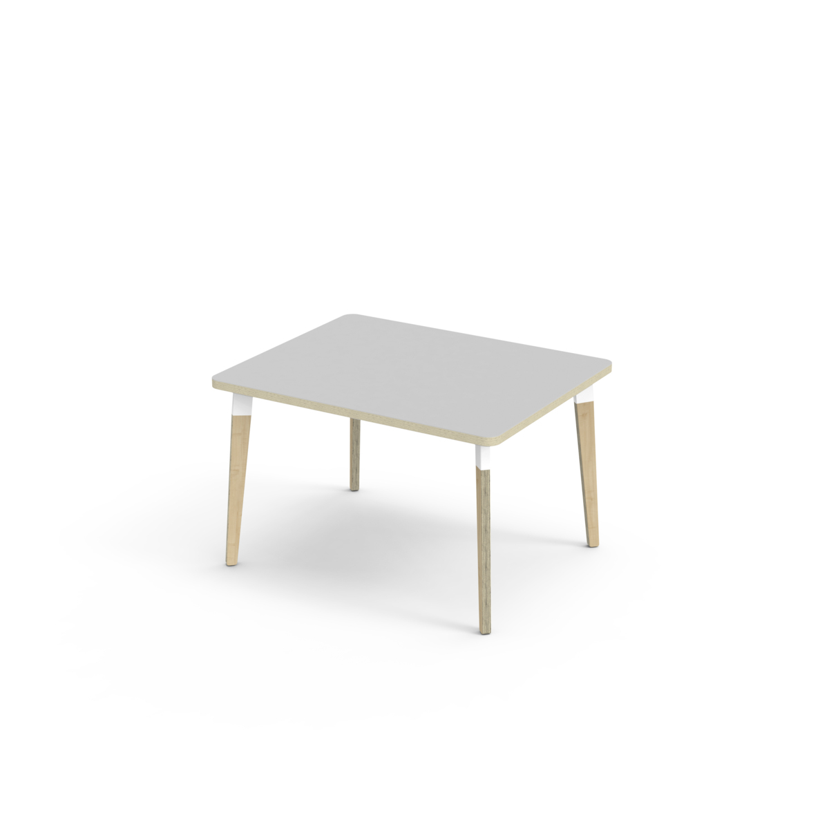 Bordplate belagt med høytrykkslaminat som gir en slitesterk overflate. Bordet har en hjørneradius på 40 mm og har et moderne og stilrent design. Bena har en rektangulær form og er laget av klarlakkert bjørkekryssfiner montert i en robust, hvit metallmansjett. Denne konstruksjonen sikrer både stabilitet og holdbarhet. Bena er lett vinklet mot hjørnene av bordplaten, noe som gir bordet et unikt og estetisk tiltalende utseende. Monteringen er enkel og lett - du trenger bare å feste metallhylsene til festepunktene i bordplaten.