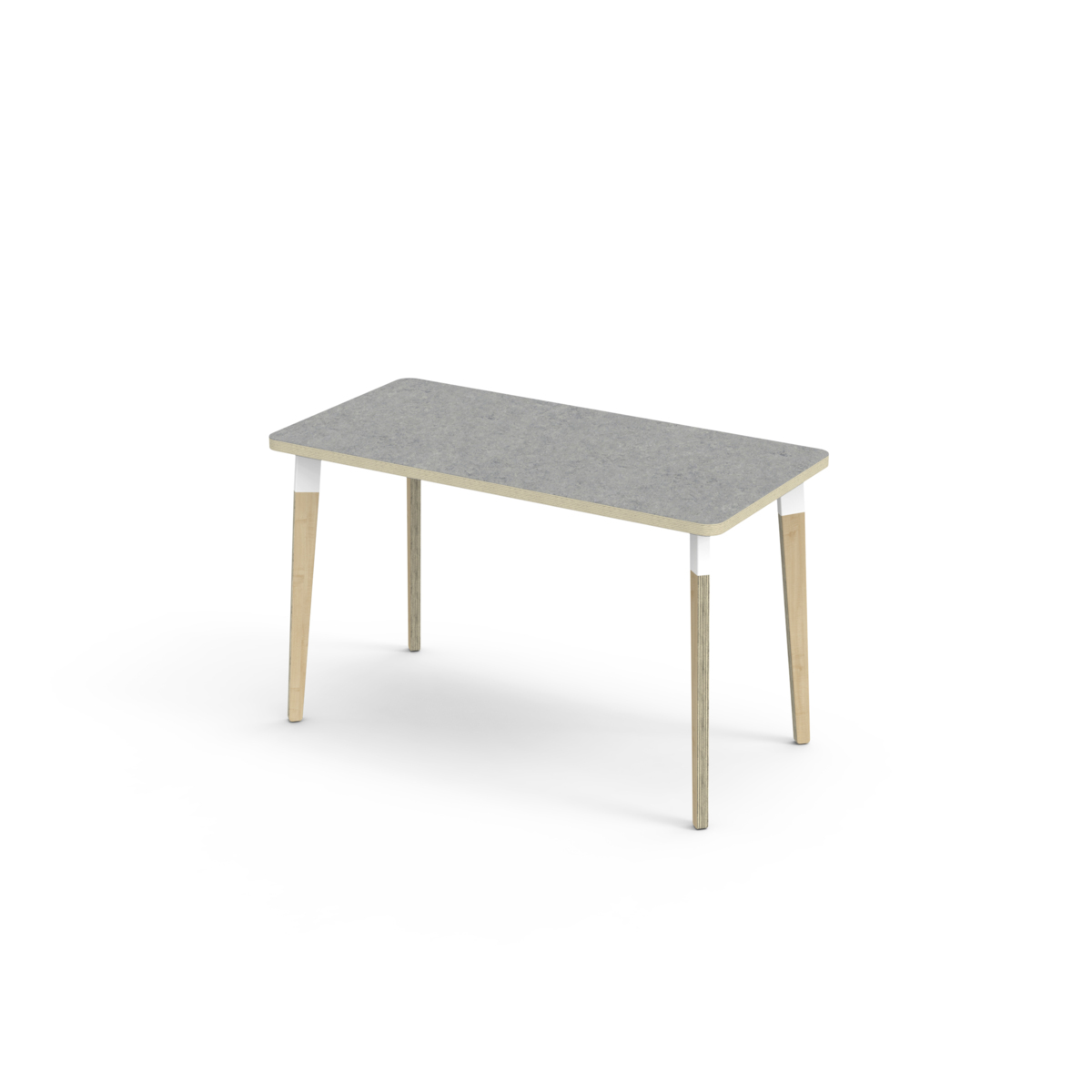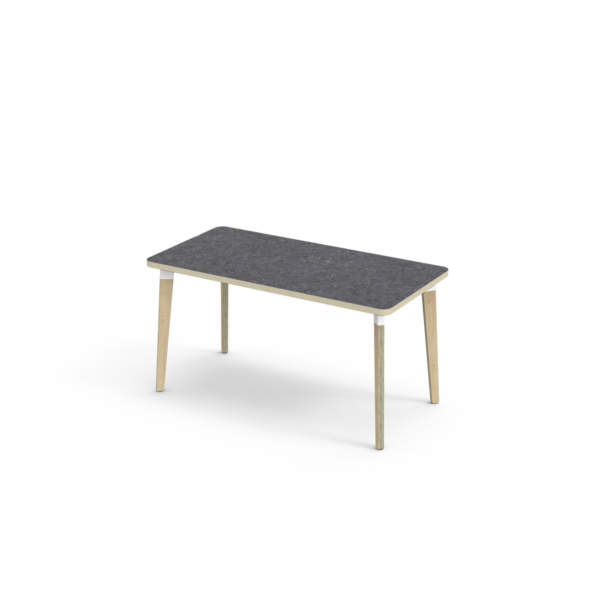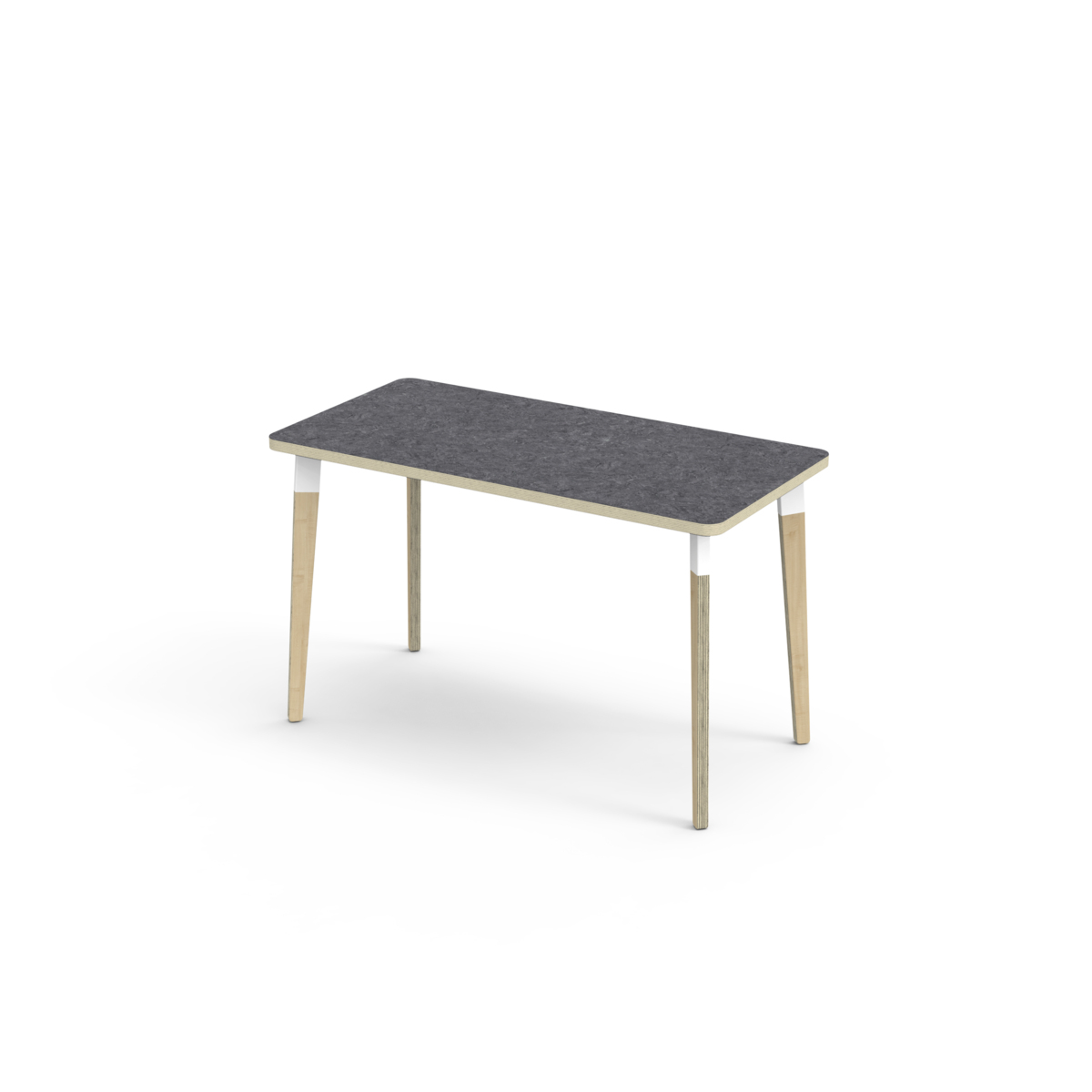 Bordplate belagt med akustikk linoleum, som gir en myk og behagelig overflate samtidig som den bidrar til et bedre lydmiljø. Bordet har en hjørneradius på 40 mm og har et moderne og stilrent design. Bena har en rektangulær form og er laget av klarlakkert bjørkekryssfiner montert i en robust, hvit metallmansjett. Denne konstruksjonen sikrer både stabilitet og holdbarhet. Bena er lett vinklet mot hjørnene av bordplaten, noe som gir bordet et unikt og estetisk tiltalende utseende. Monteringen er enkel og lett - du trenger bare å feste metallhylsene til festepunktene i bordplaten.