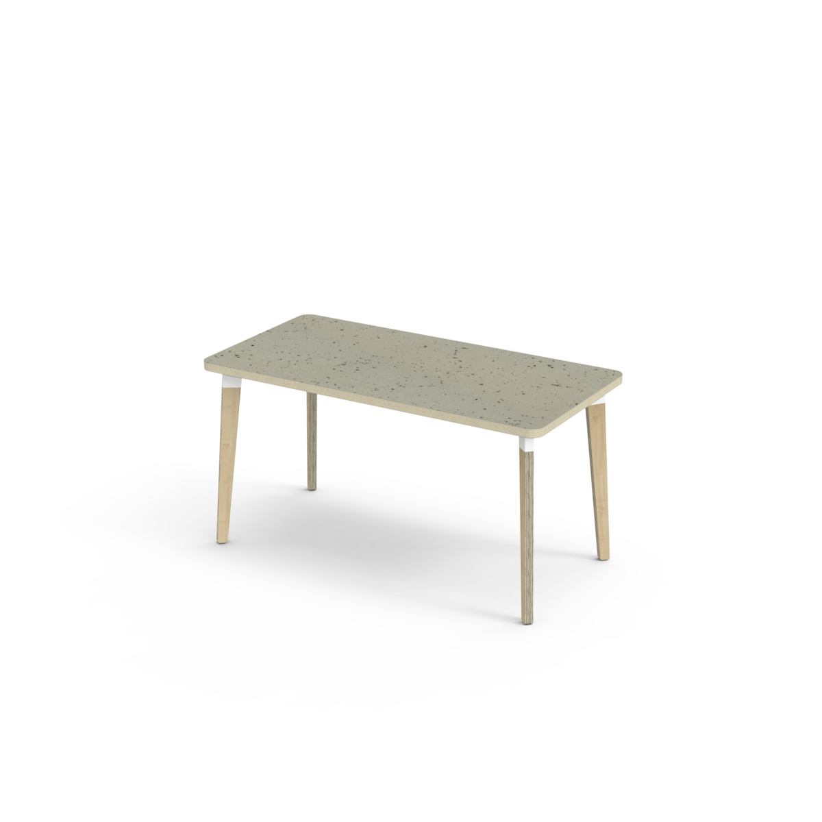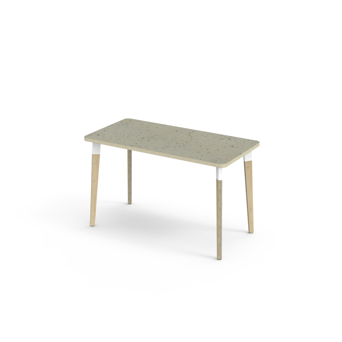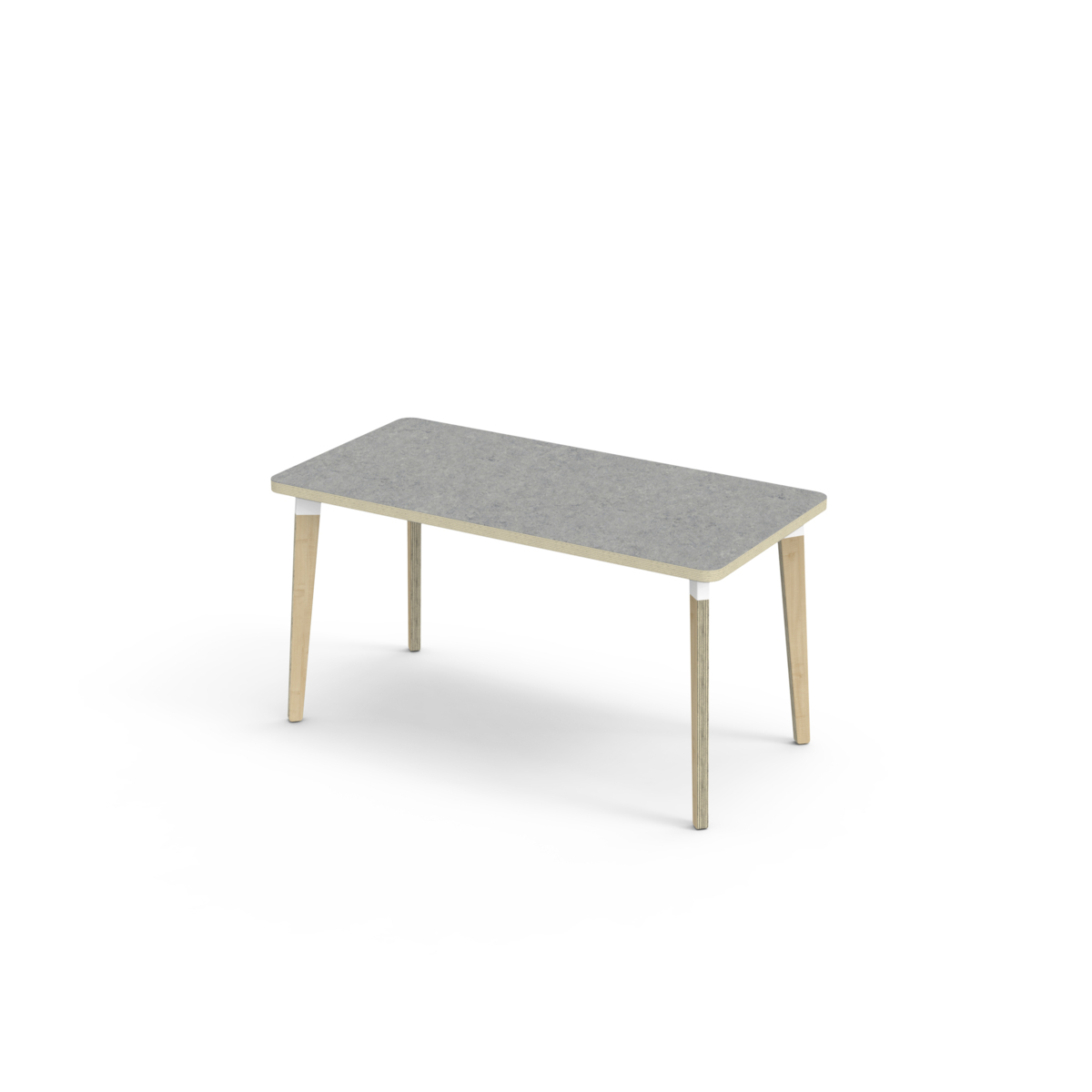 Bordplate belagt med akustikk linoleum, som gir en myk og behagelig overflate samtidig som den bidrar til et bedre lydmiljø. Bordet har en hjørneradius på 40 mm og har et moderne og stilrent design. Bena har en rektangulær form og er laget av klarlakkert bjørkekryssfiner montert i en robust, hvit metallmansjett. Denne konstruksjonen sikrer både stabilitet og holdbarhet. Bena er lett vinklet mot hjørnene av bordplaten, noe som gir bordet et unikt og estetisk tiltalende utseende. Monteringen er enkel og lett - du trenger bare å feste metallhylsene til festepunktene i bordplaten.