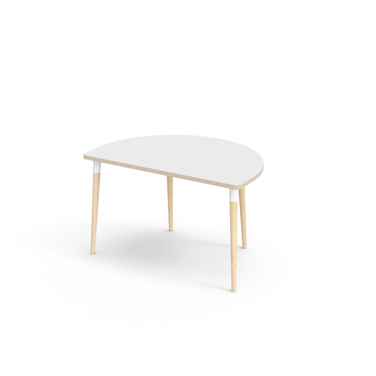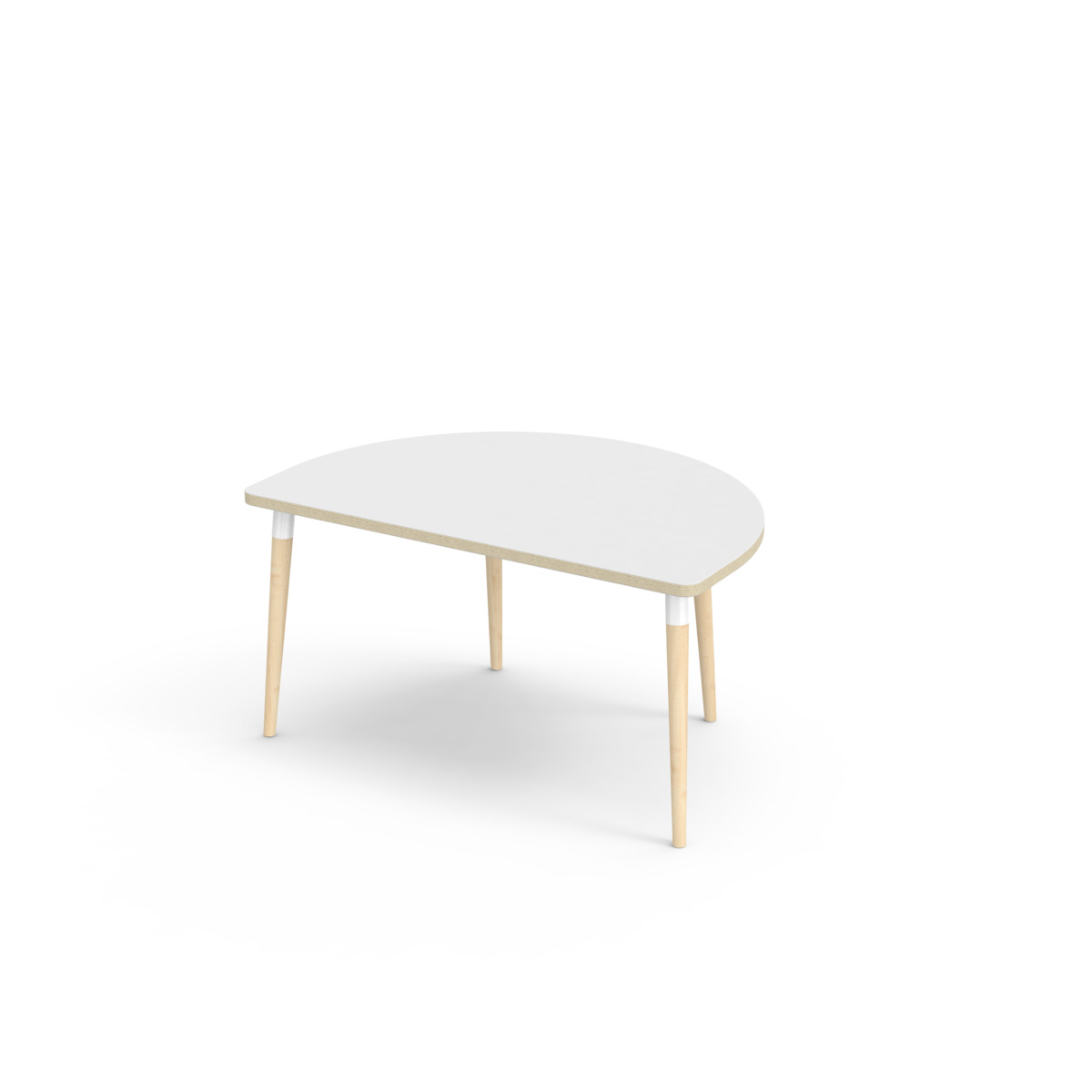 Lydabsorberende bordplate belagt med høytrykkslaminat, som gir en slitesterk overflate. Med en hjørneradius på 40 mm får bordet et moderne og stilig design. Bena er koniske og laget av klarlakkert massiv bjørk og montert i en solid hvit metallhylse. Denne konstruksjonen sikrer både stabilitet og holdbarhet. Bena er litt vinklet ut mot hjørnene på bordplaten, noe som gir bordet et unikt og estetisk tiltalende utseende. Monteringen er enkel – du trenger bare å feste metallhylsene tilfestepunktene i bordplaten.