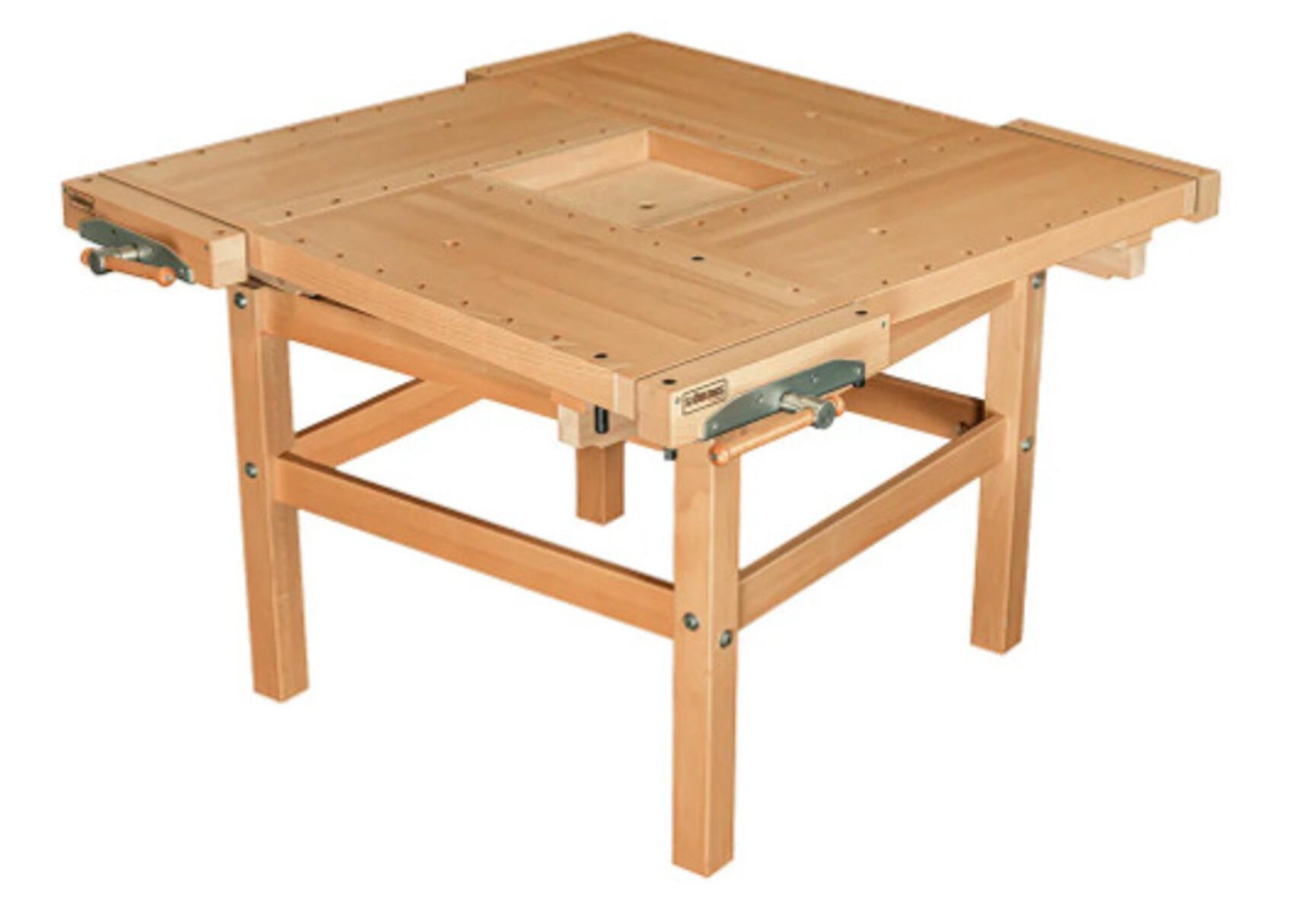 Sløydbenk med plate og understell i massiv klarlakkert bøk. Skiven er utstyrt med doble rekker med krokhull for runde kroker, som gir mer fleksibel innspenning. Benkgruppen er satt sammen av 4 plater som måler L128,5xH6cm. Totalmål: 130x130xh90 cm. Maks åpning i tang 13cm. Inkludert: 1 vendbar verktøyskuff, 4 svingbare krakker, 4 beskyttelser og 4 benkstrammere.