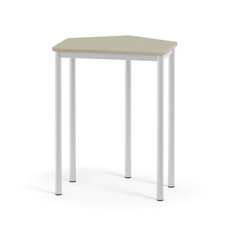 Pentagonformet bordplate belagt med akustikk linoleum. Justerbare føtter for tilpasning til ujevne gulv. Understell i hvit RAL9003.