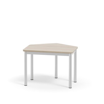 Pentagonformet bordplate belagt med laminat. Justerbare føtter for tilpasning til ujevne gulv. Understell i hvit RAL9003.