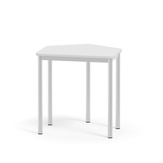 Pentagonformet bordplate belagt med høytrykkslaminat. Justerbare føtter for tilpasning til ujevne gulv. Understell i hvit RAL9003.