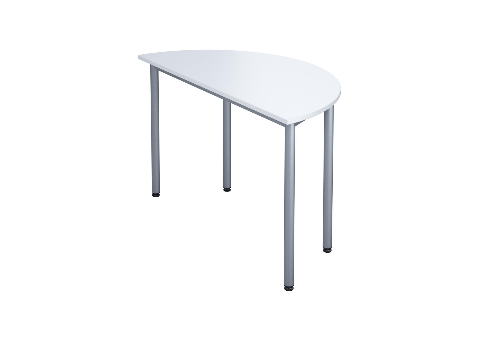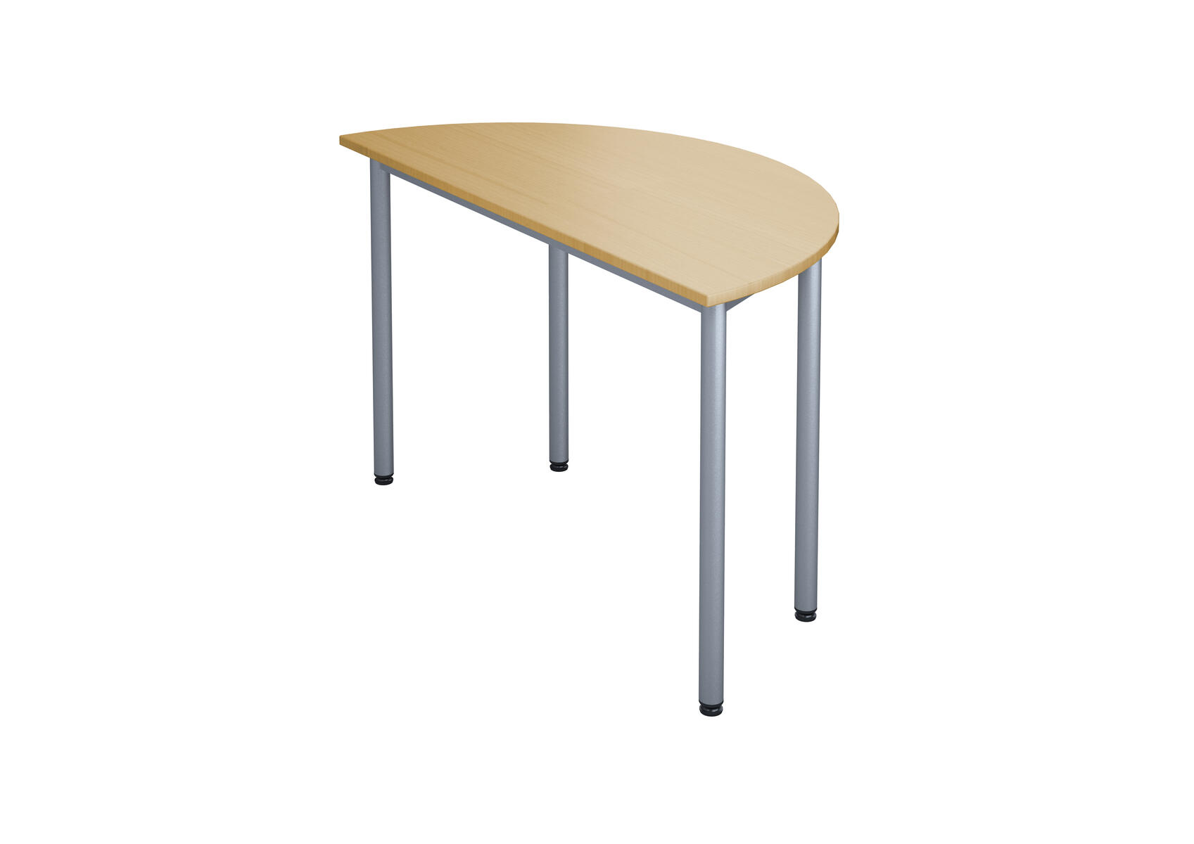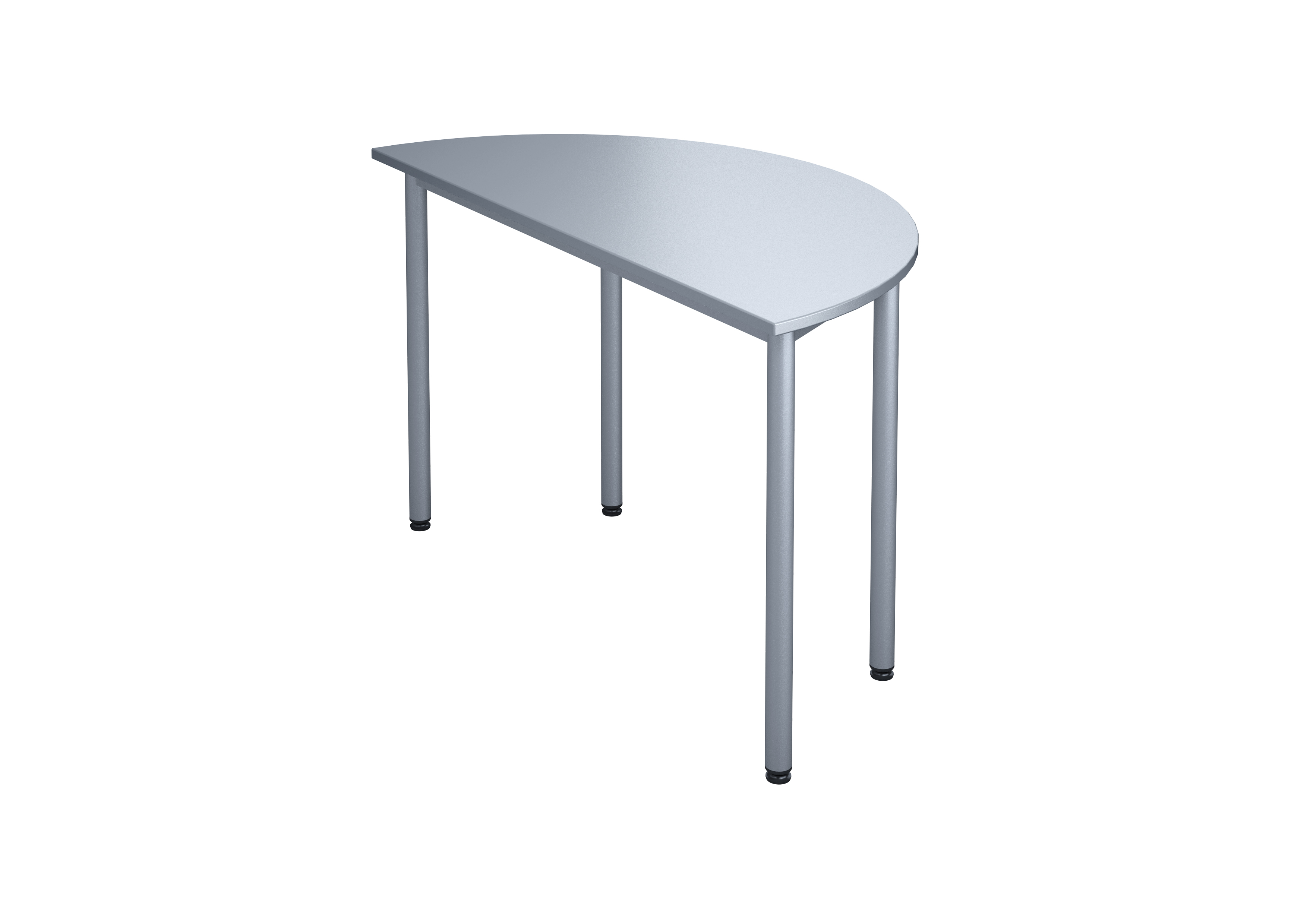 Halvrundt bord med bordplate med kjerne av møbelspon, har direktelaminert over og underside. Kraftig slagfast 2 mm ABS kantlist, rett kant. Understell i stål med helsveisede sarger, u-bjelkeforsterkninger i hjørnene og runde ben Ø40 mm. Med stillskrue for tilpasning til ujevne underlag. Epoxylakkert understell i sølvgrå RAL9006.