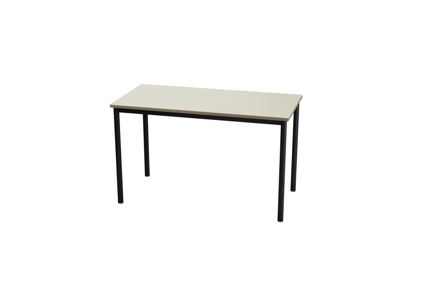 Bordplate i 12 mm kompakt laminat, laminerte kanter. Velg enten 2 ben med justerbar fot og 2 ben med hjul, eller alle ben med fast fot. Bordet har helsveiset understell, hjulene er innfelt i bena. Understell i RAL 9006 sølv.