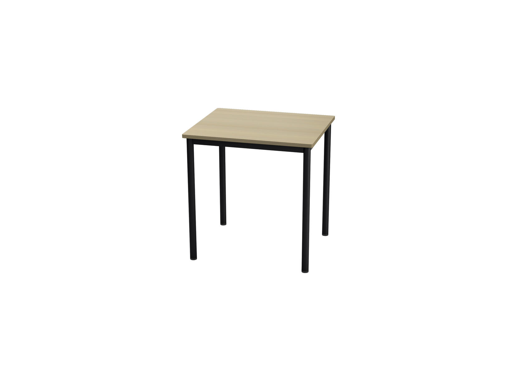 Bordplate i 20 mm laminert kryssfiner. Klarlakkerte kanter. Velg enten 2 ben med justerbar fot og 2 ben med hjul, eller alle ben med fast fot. Bordet har helsveiset understell, hjulene er innfelt i bena. Understell i RAL 9006 sølv.