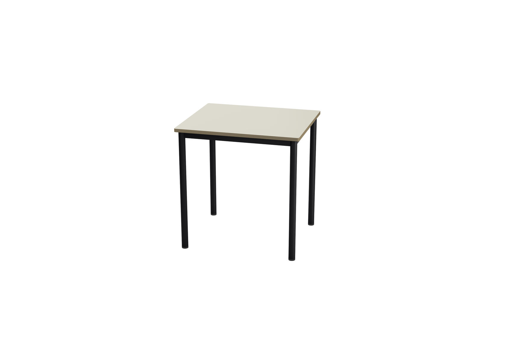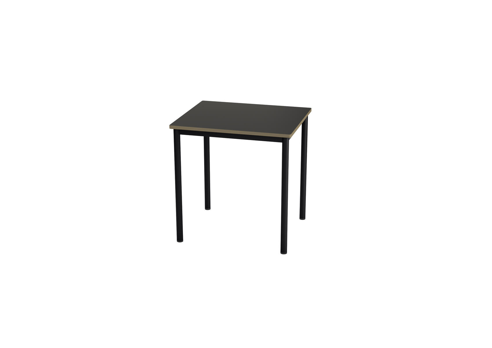 Bord med støydempende overflate i linoleum. Kraftig slagfast 2 mm ABS kantlist, rett kant. Understell i stål med helsveisede sarger, u-bjelkeforsterkninger i hjørnene og runde ben Ø40 mm. Med stillskrue for tilpasning til ujevne underlag. Epoxylakkert understell i sølvgrå RAL9006.