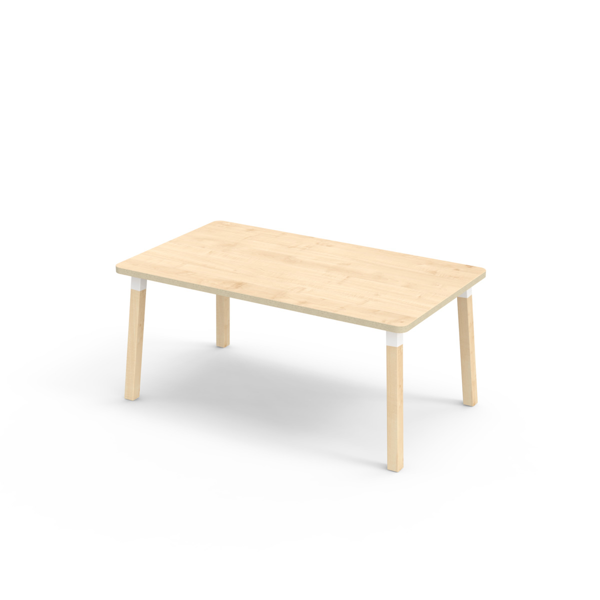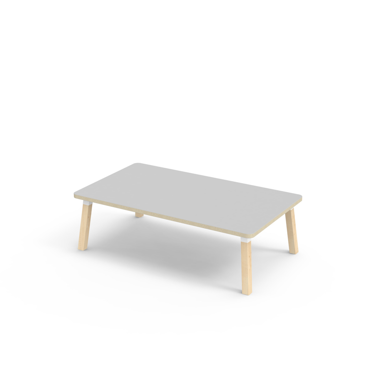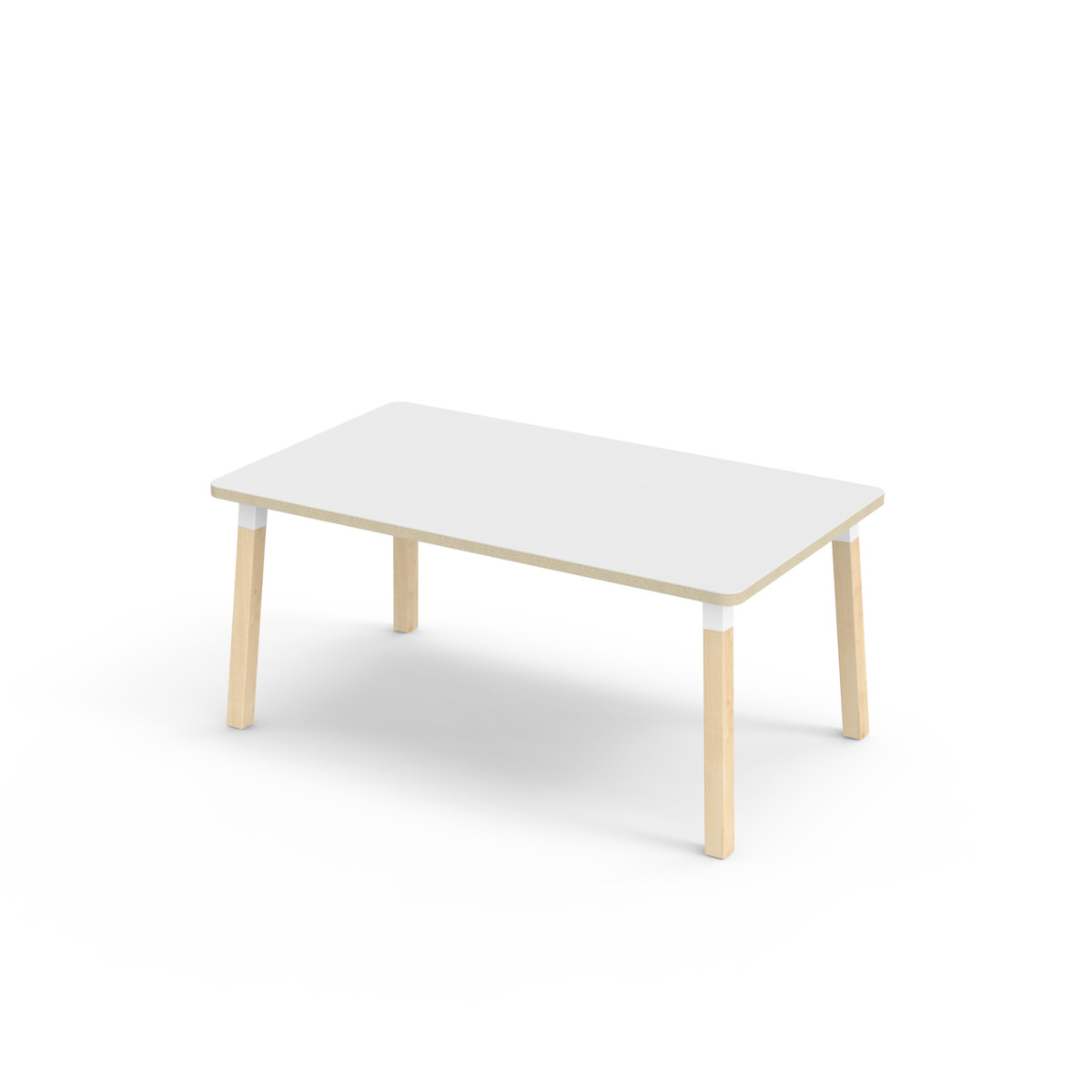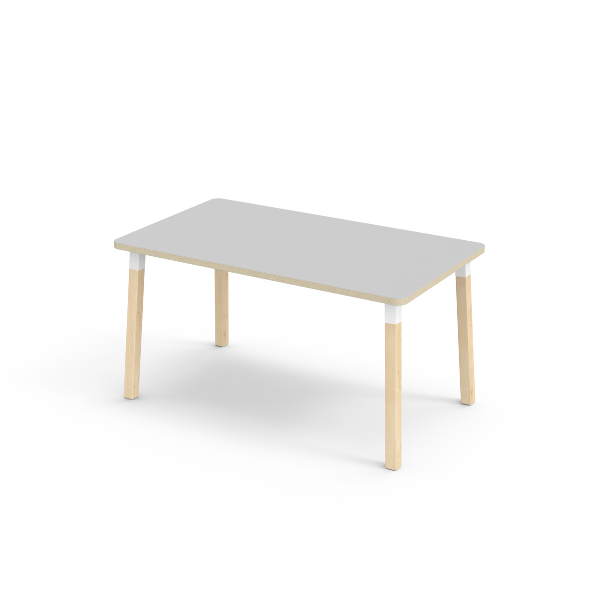 Lydabsorberende bordplate belagt med høytrykkslaminat, noe som gir en slitesterk overflate. Bordet har en hjørneradius på 40 mm og et moderne og stilrent design. Bena er laget av klarlakkert massiv bjørk og montert i en robust, hvit metallmansjett. Denne konstruksjonen sikrer både stabilitet og holdbarhet. Bena er lett vinklet mot hjørnene av bordplaten, noe som gir bordet et unikt og estetisk tiltalende utseende. Monteringen er enkel og lett - du trenger bare å feste metallhylsene til festepunktene i bordplaten.