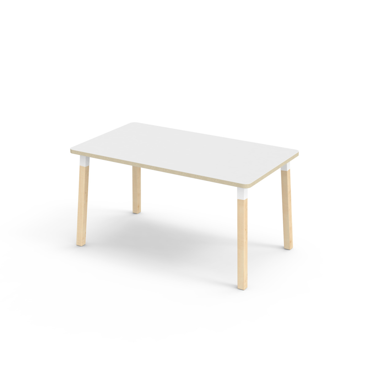 Bordplaten er belagt med høytrykkslaminat, noe som gir en slitesterk overflate. Bordet har en hjørneradius på 40 mm og et moderne og stilrent design. Bena er laget av klarlakkert massiv bjørk og montert i en robust, hvit metallmansjett. Denne konstruksjonen sikrer både stabilitet og holdbarhet. Bena er lett vinklet mot hjørnene av bordplaten, noe som gir bordet et unikt og estetisk tiltalende utseende. Monteringen er enkel og lett - du trenger bare å feste metallhylsene til festepunktene i bordplaten
