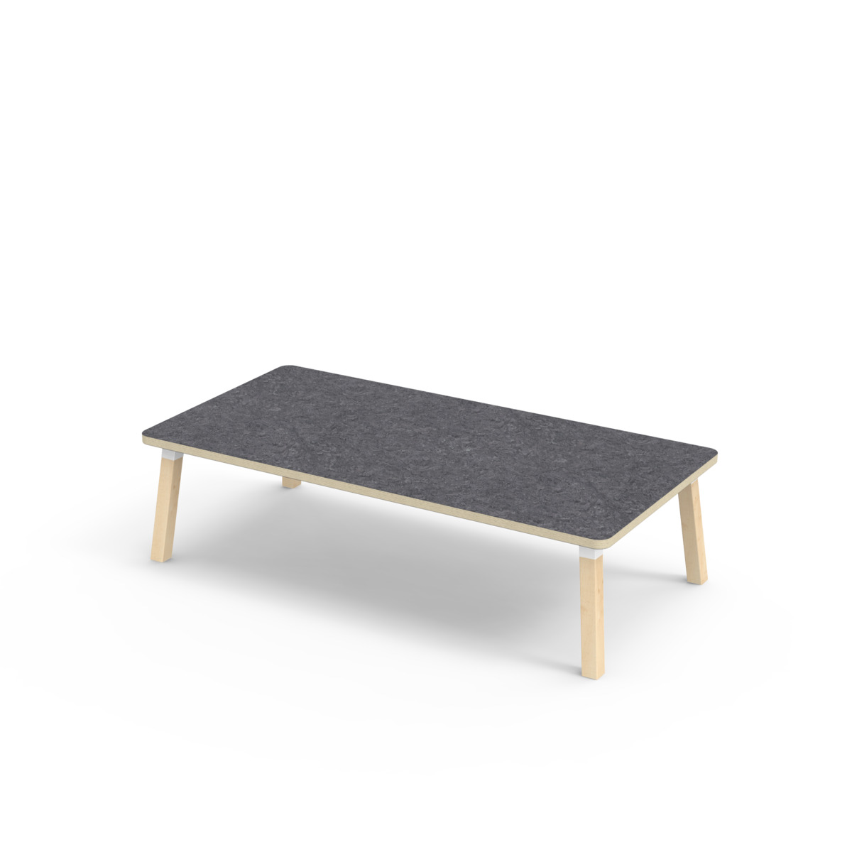 Bordplaten er belagt med akustisk linoleum, som gir en myk og behagelig overflate samtidig som den bidrar til et bedre lydmiljø. Bordet har en hjørneradius på 40 mm og et moderne og stilrent design. Bena er laget av klarlakkert massiv bjørk og montert i en robust, svart metallmansjett. Denne konstruksjonen sikrer både stabilitet og holdbarhet. Bena er lett vinklet mot hjørnene av bordplaten, noe som gir bordet et unikt og estetisk tiltalende utseende. Monteringen er enkel og lett - du trenger bare å feste metallhylsene til festepunktene i bordplaten.