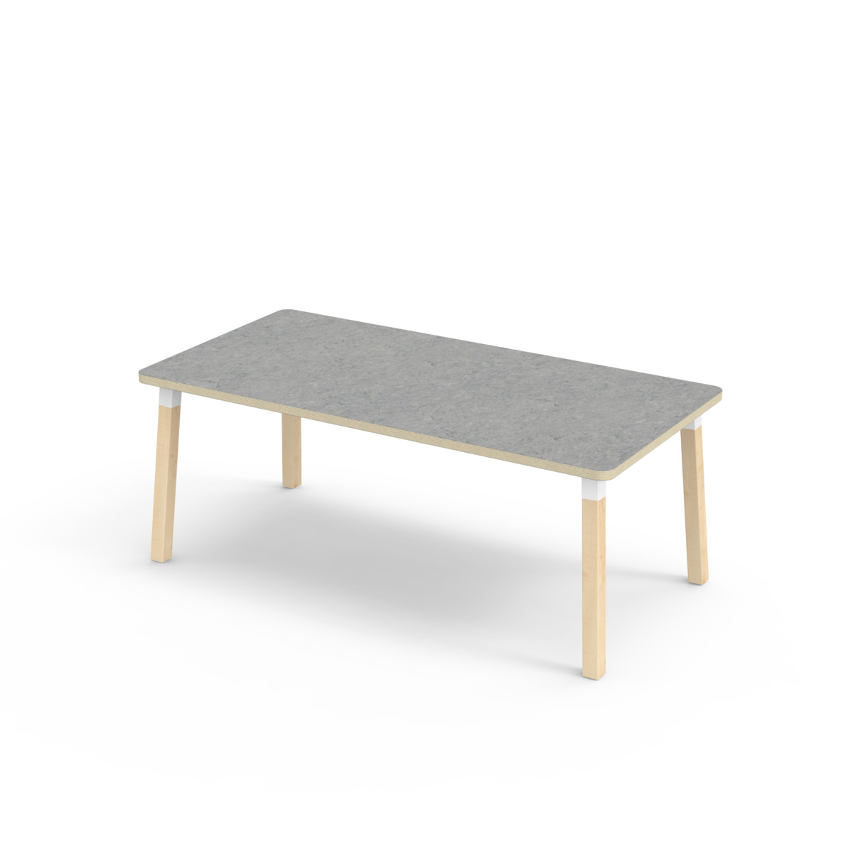Bordplaten er belagt med akustisk linoleum, som gir en myk og behagelig overflate samtidig som den bidrar til et bedre lydmiljø. Bordet har en hjørneradius på 40 mm og et moderne og stilrent design. Bena er laget av klarlakkert massiv bjørk og montert i en robust, hvit metallmansjett. Denne konstruksjonen sikrer både stabilitet og holdbarhet. Bena er lett vinklet mot hjørnene av bordplaten, noe som gir bordet et unikt og estetisk tiltalende utseende. Monteringen er enkel og lett - du trenger bare å feste metallhylsene til festepunktene i bordplaten.