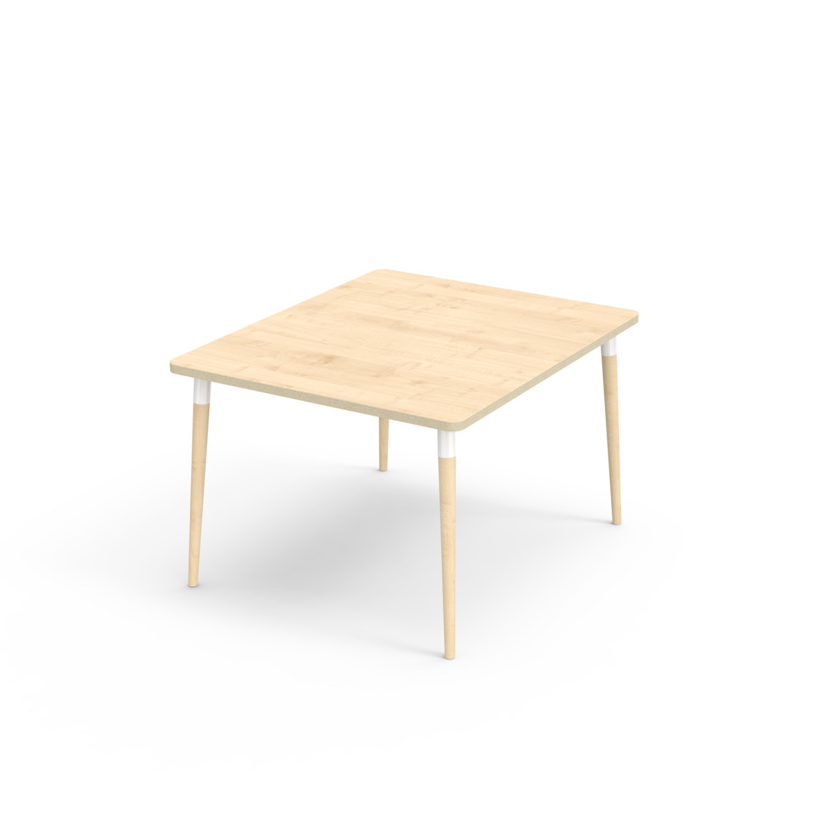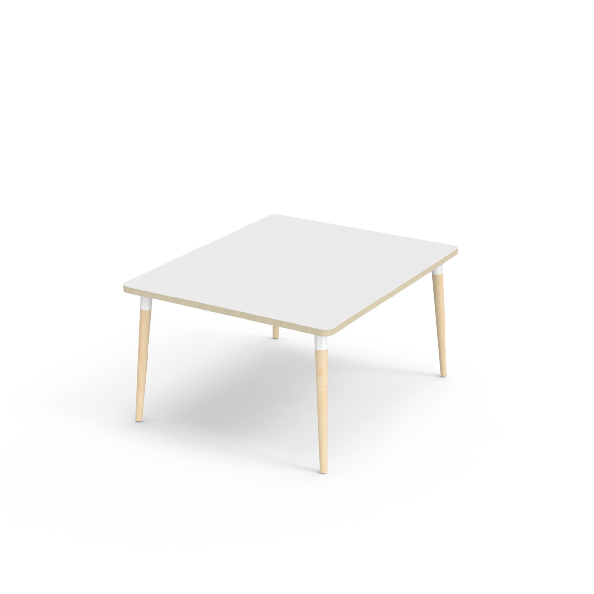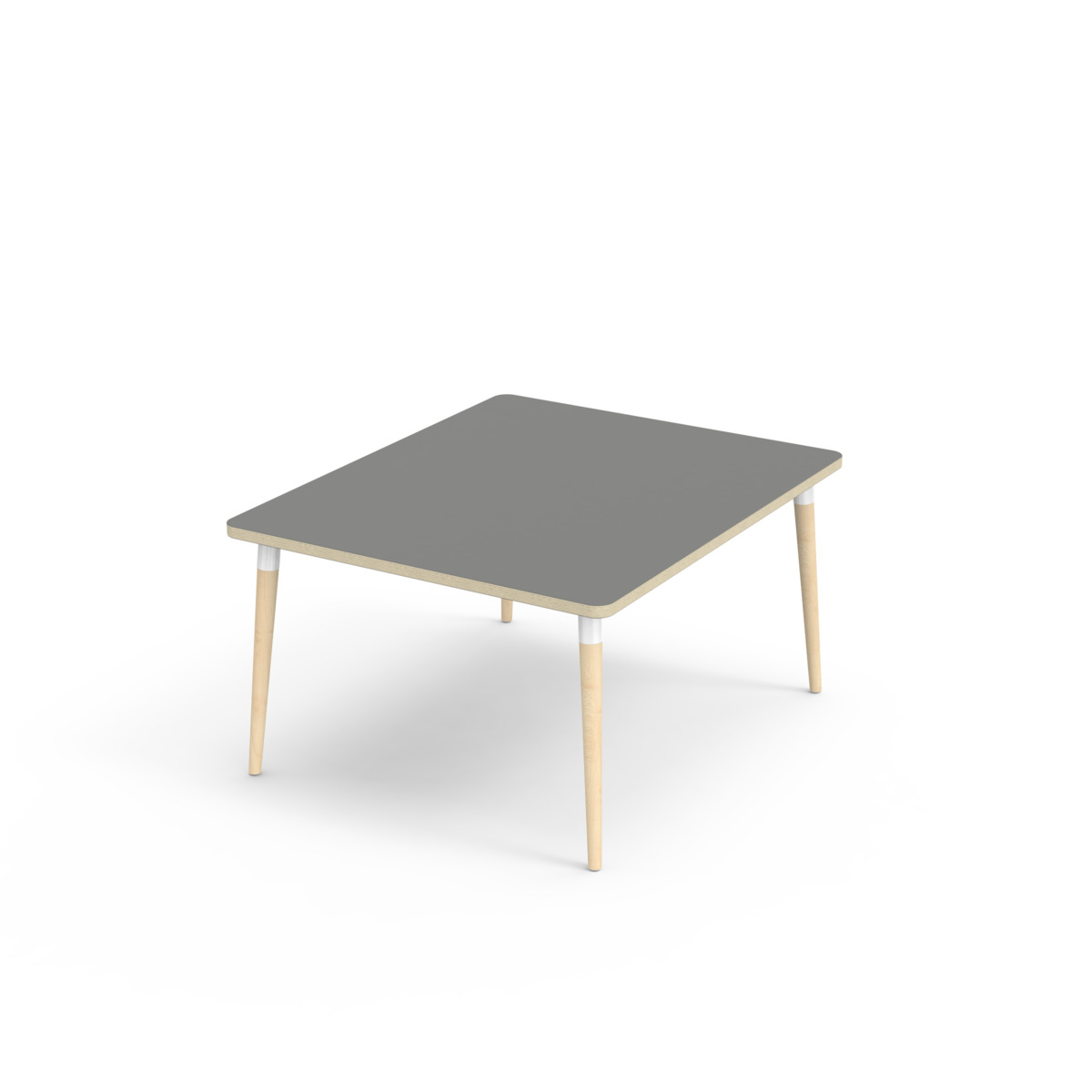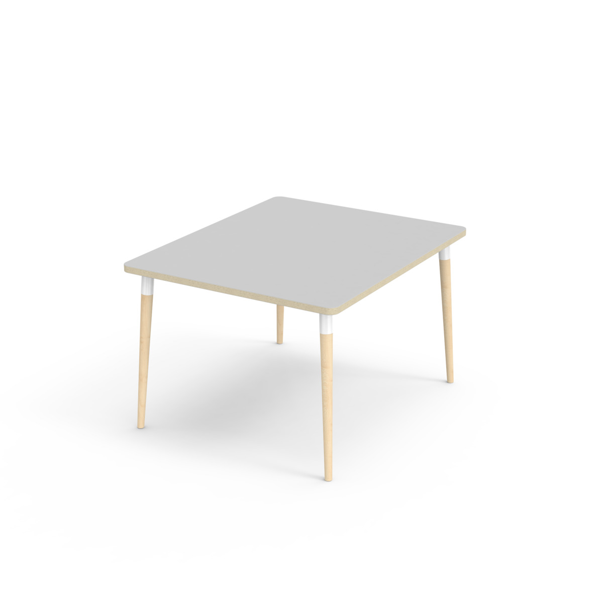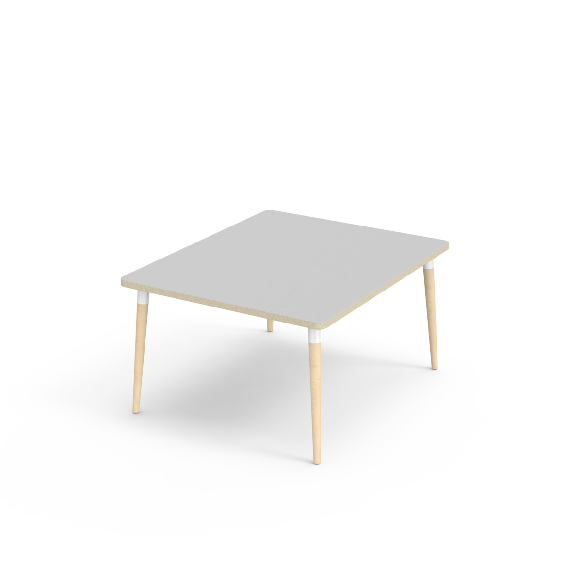 Lydabsorberende bordplate belagt med høytrykkslaminat, som gir en slitesterk overflate. Med en hjørneradius på 40 mm får bordet et moderne og stilig design. Bena er koniske og laget av klarlakkert massiv bjørk og montert i en solid hvit metallhylse. Denne konstruksjonen sikrer både stabilitet og holdbarhet. Bena er litt vinklet ut mot hjørnene på bordplaten, noe som gir bordet et unikt og estetisk tiltalende utseende. Monteringen er enkel – du trenger bare å feste metallhylsene tilfestepunktene i bordplaten.