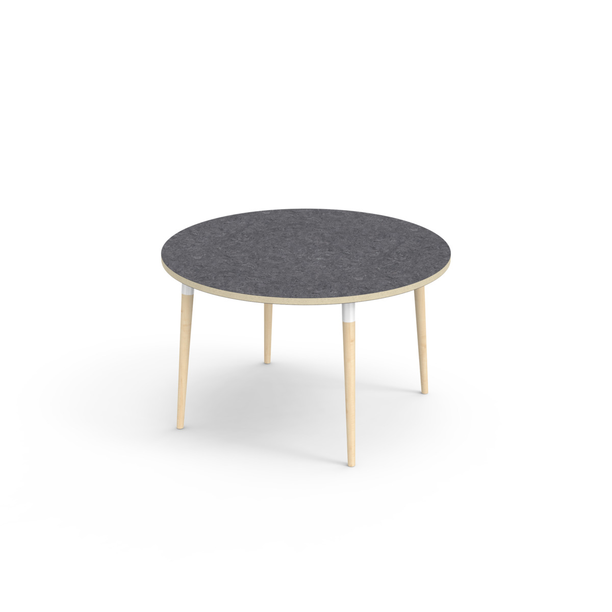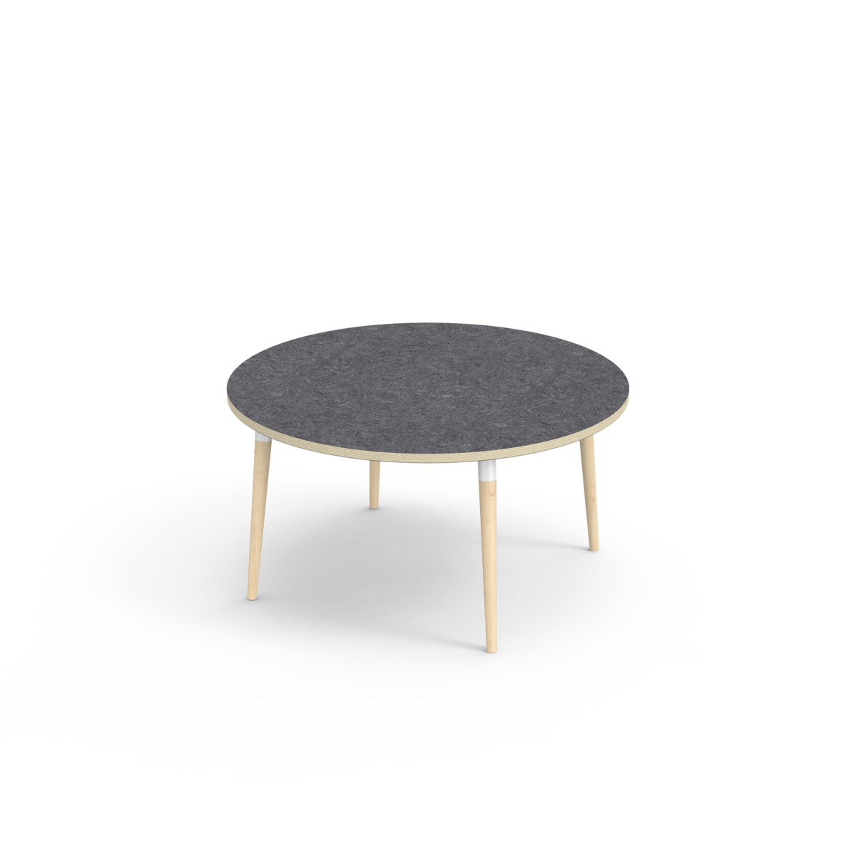 Bordplate belagt med akustisk linoleum, som gir en myk og behagelig overflate samtidig som den bidrar til et bedre lydmiljø. Med en hjørneradius på 40 mm får bordet et moderne og stilig design. Bena er koniske og laget av klarlakkert massiv bjørk og montert i en solid svart metallhylse. Denne konstruksjonen sikrer både stabilitet og holdbarhet. Bena er litt vinklet ut mot hjørnene på bordplaten, noe som gir bordet et unikt og estetisk tiltalende utseende. Monteringen er enkel – du trenger bare å feste metallhylsene tilfestepunktene i bordplaten.
