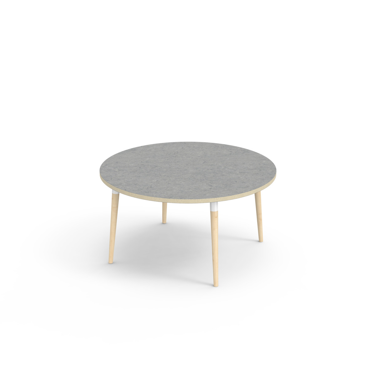 Bordplate belagt med akustisk linoleum, som gir en myk og behagelig overflate samtidig som den bidrar til et bedre lydmiljø. Med en hjørneradius på 40 mm får bordet et moderne og stilig design. Bena er koniske og laget av klarlakkert massiv bjørk og montert i en solid hvit metallhylse. Denne konstruksjonen sikrer både stabilitet og holdbarhet. Bena er litt vinklet ut mot hjørnene på bordplaten, noe som gir bordet et unikt og estetisk tiltalende utseende. Monteringen er enkel – du trenger bare å feste metallhylsene tilfestepunktene i bordplaten.