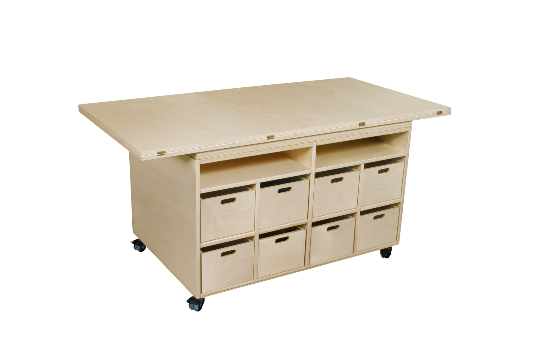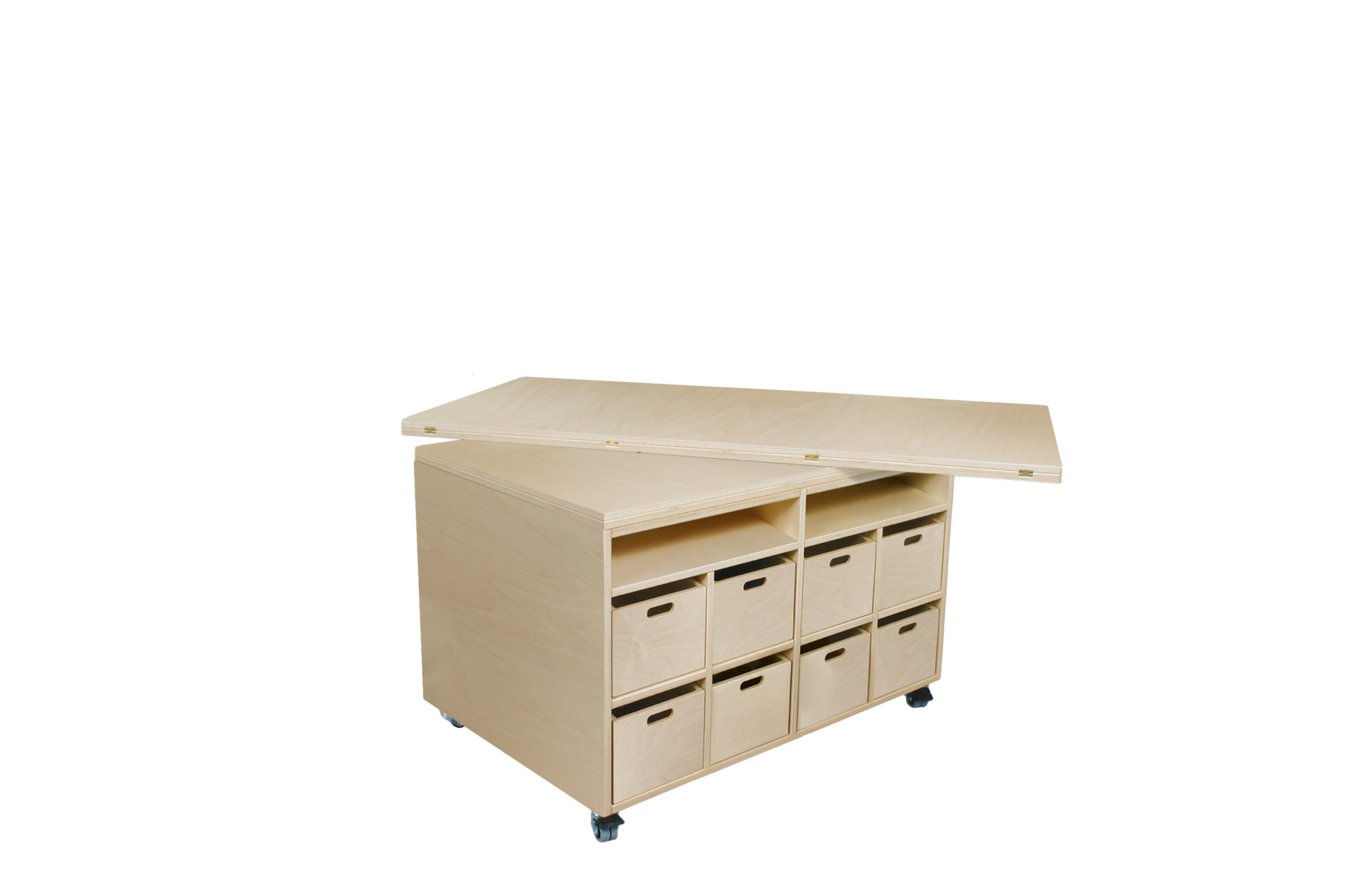 Bord i klarlakkert bjørk kryssfiner med hjul. Inneholder 16 oppbevaringsbokser og passer fint i et makerspace. Sammenlagt er bordet 160x80 cm, og utfelt 160x1060 cm. Høyde 72 cm