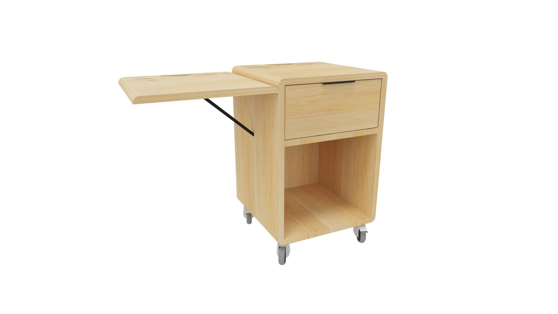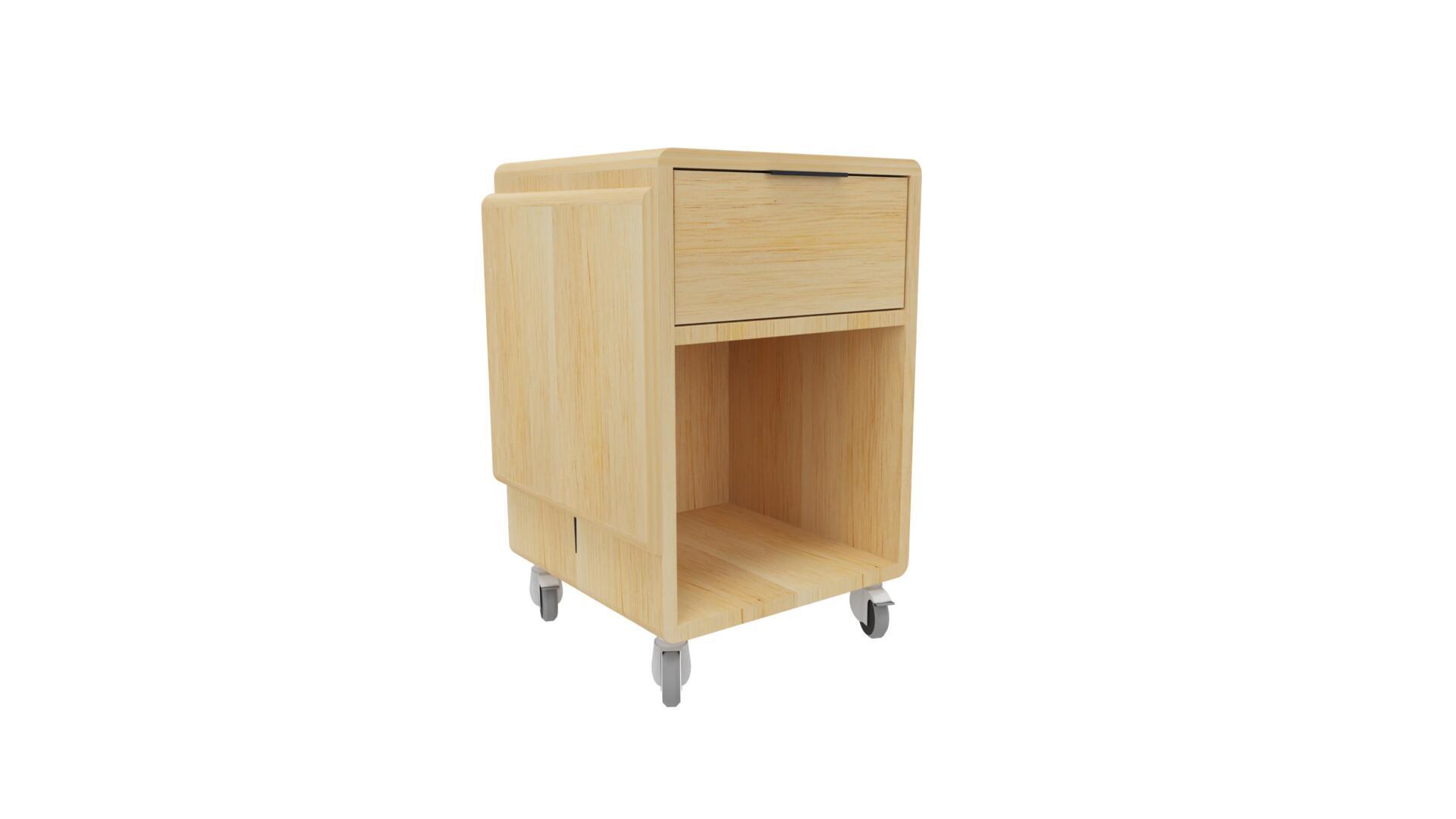 70x40x40 cm med en skuff øverst og en åpen hylle. Kjerne av MDF belagt med bjørk HPL. Bøylehåndtak i sølv og klaff er inkludert. På hjul for enkel manøvrering.